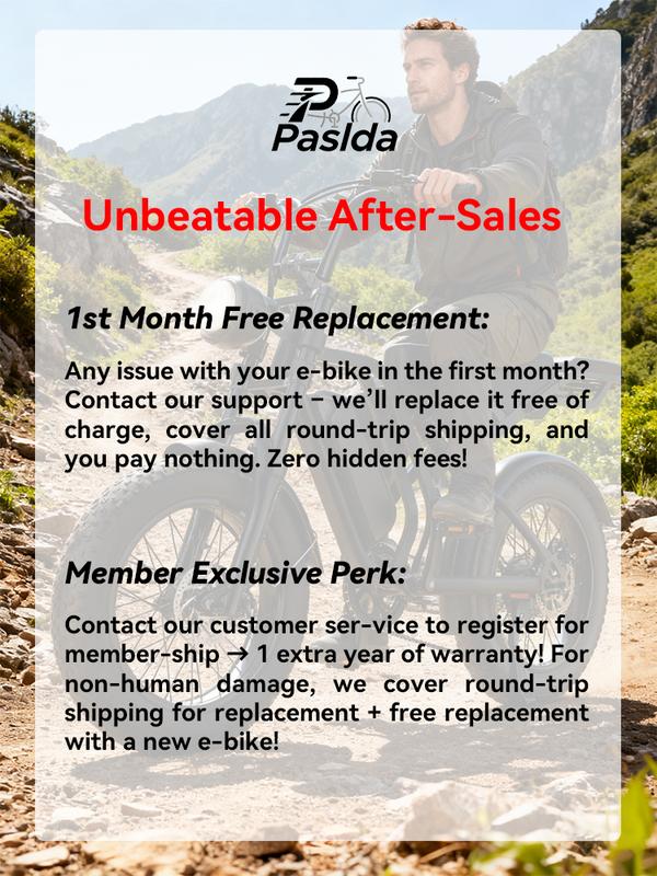 ·Member Exclusive Perk: Register for membership to receive 1 extra year of warranty—for non-human-caused damage, we cover shipping and replace the e-bike at no cost