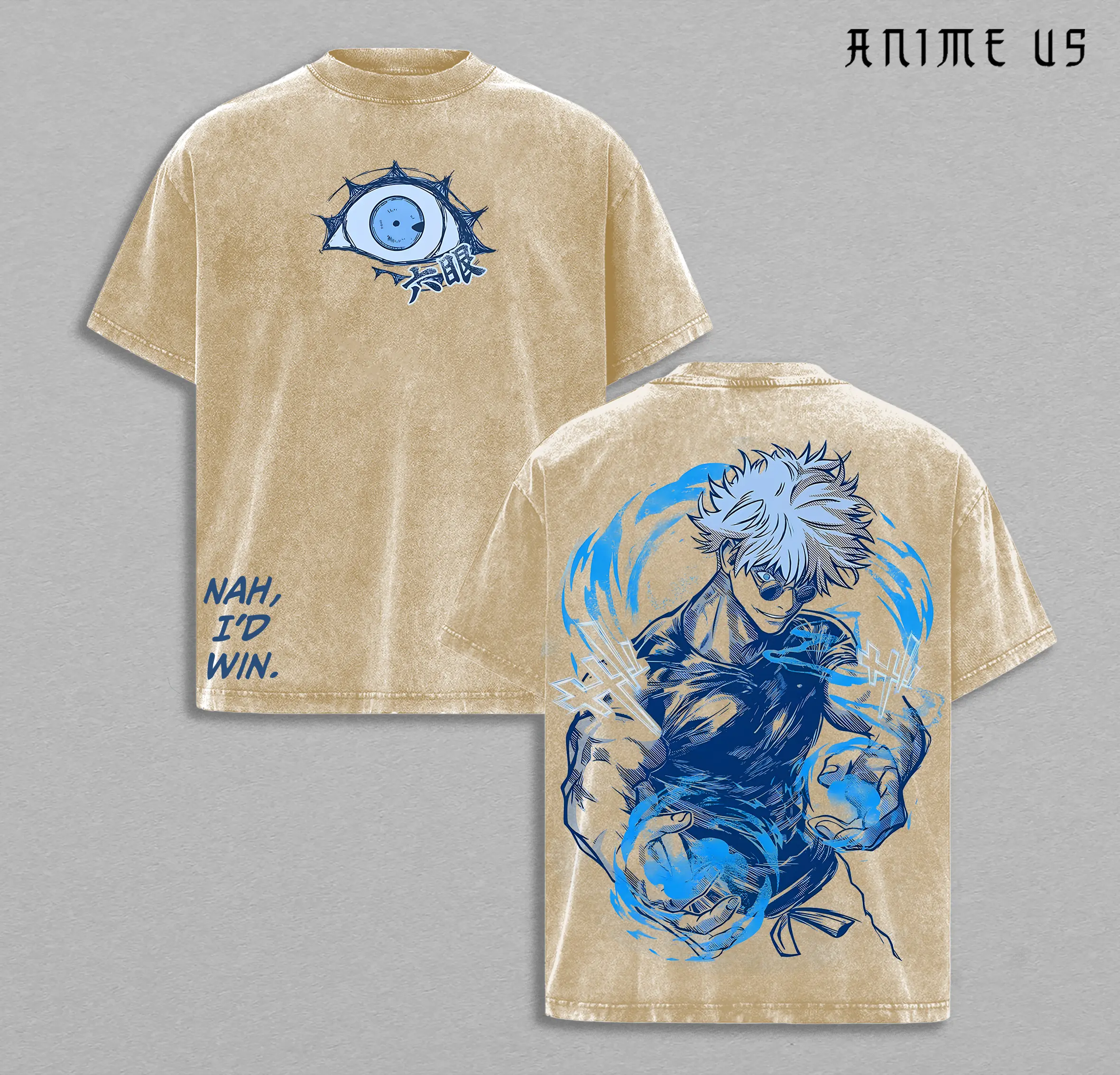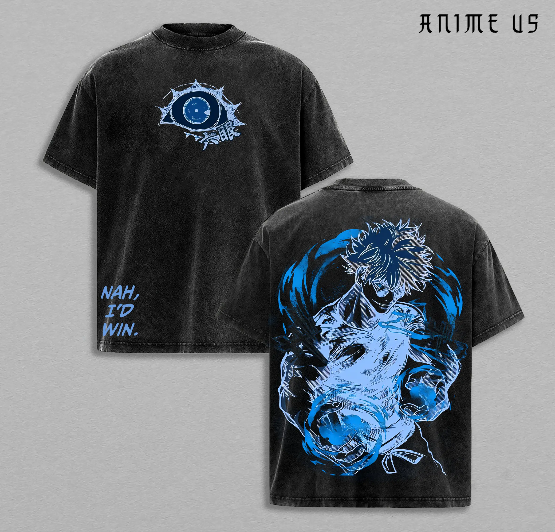Gojo Satoru “Nah, I’d Win” Tee | JJK Anime Graphic T-Shirt | Vintage Washed Oversized Streetwear | Blue Cursed Energy Design | Jujutsu Kaisen Manga Fan Tee