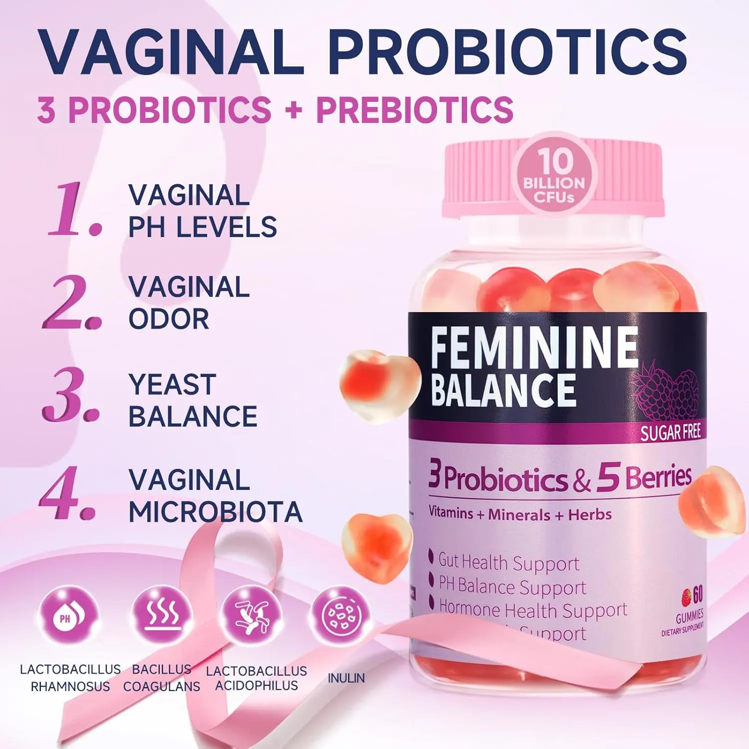[ Health & Microbiome Support] Our probiotics formula delivers 10 Billion CFUs of Bacillus coagulans, L. acidophilus, and L. rhamnosus-plus prebiotic inulin from Jerusalem artichoke-to support healthy l pH, yeast balance, and flora.This precise blend also promotes digestive wellness, immune strength, and all-day feminine freshness.