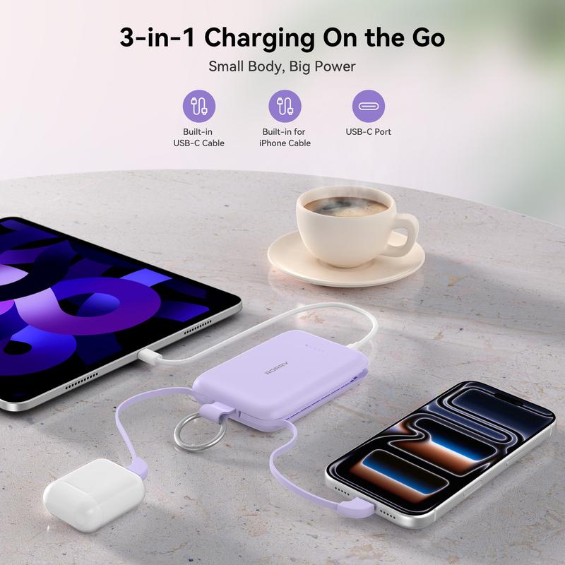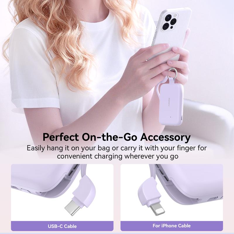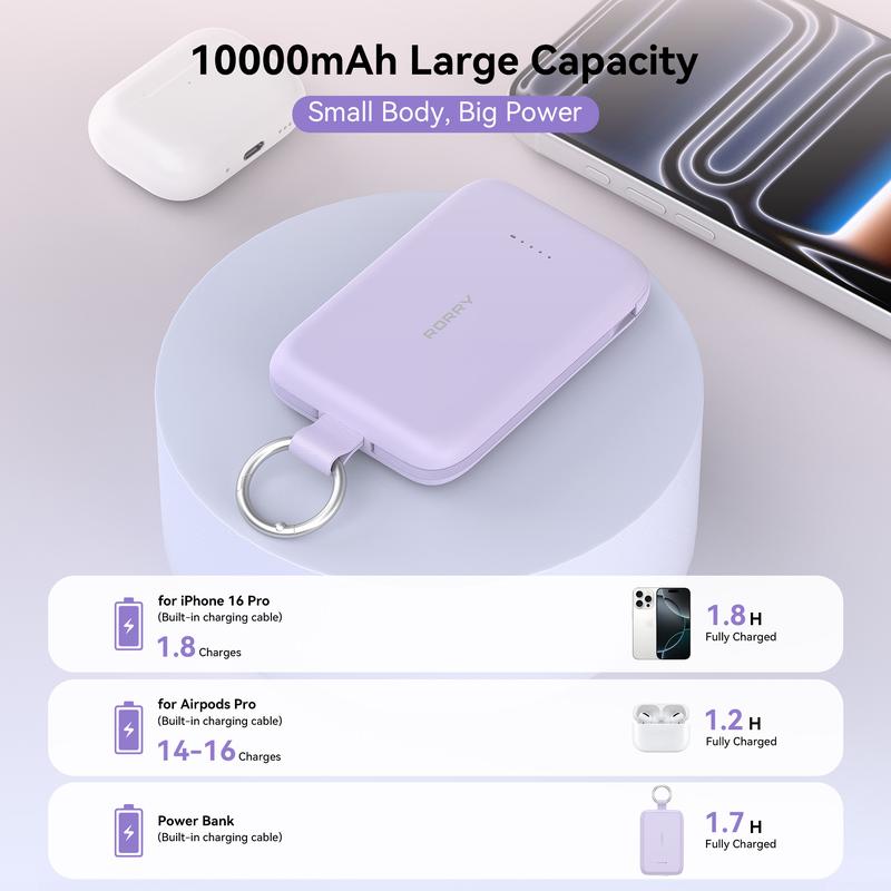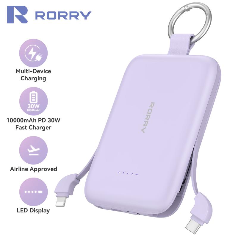 The RORRY 10000mAh portable charger features two built-in cables, compatible with Android phones and iPhones. No additional cables needed, reducing travel clutter. It supports 3 outputs & 1 input: 1 iOS cable, 1 USB C,and 1 USB C charging cable.