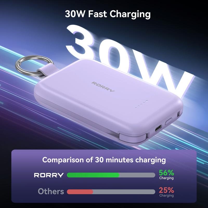 PD3.0 and QC4.0 technology ensures fast charging. The built-in USB C cable support 30W fast charging, while the USB-C port supports PD30W output. Charges an iPhone 17 from 0% to 50% in just 25 minutes.