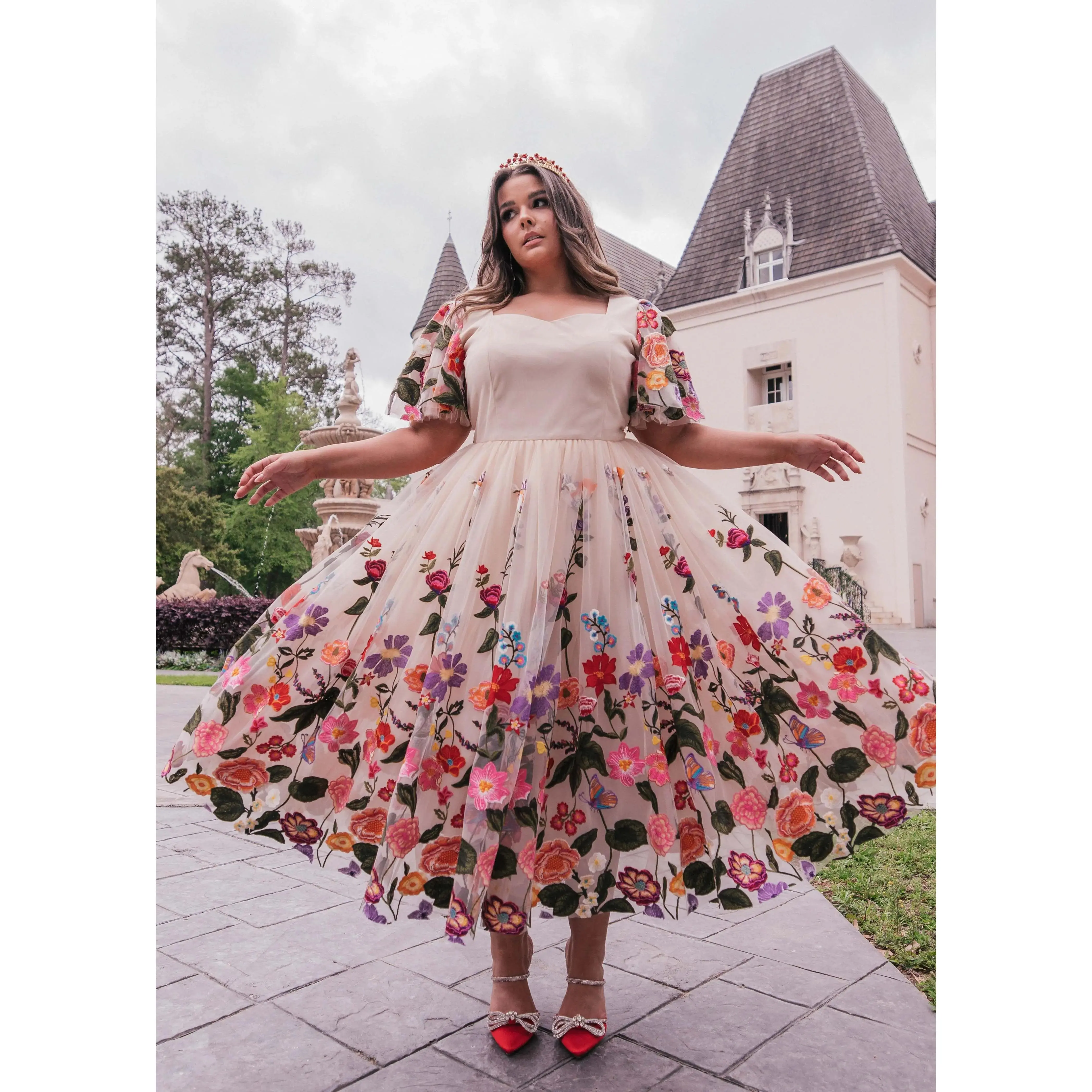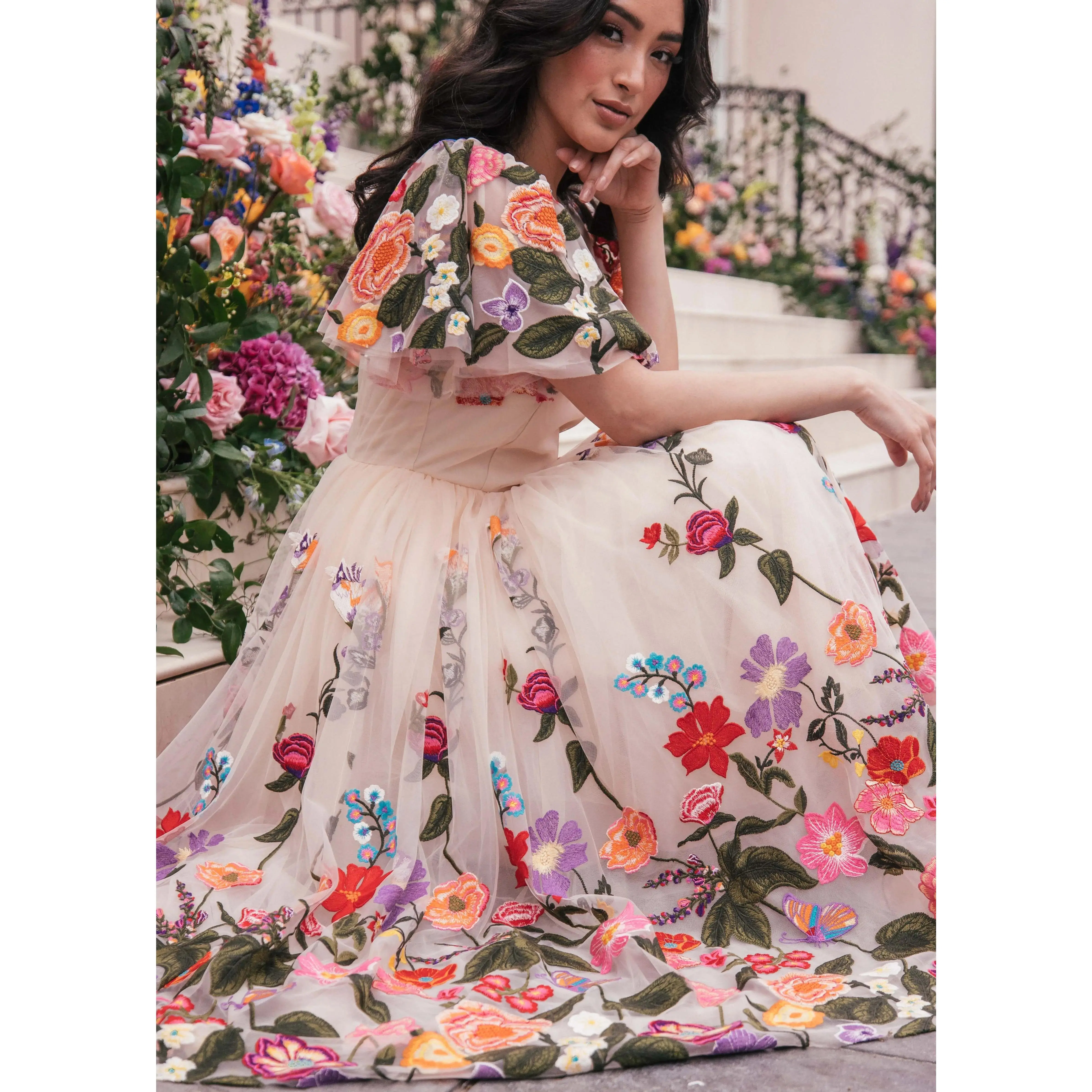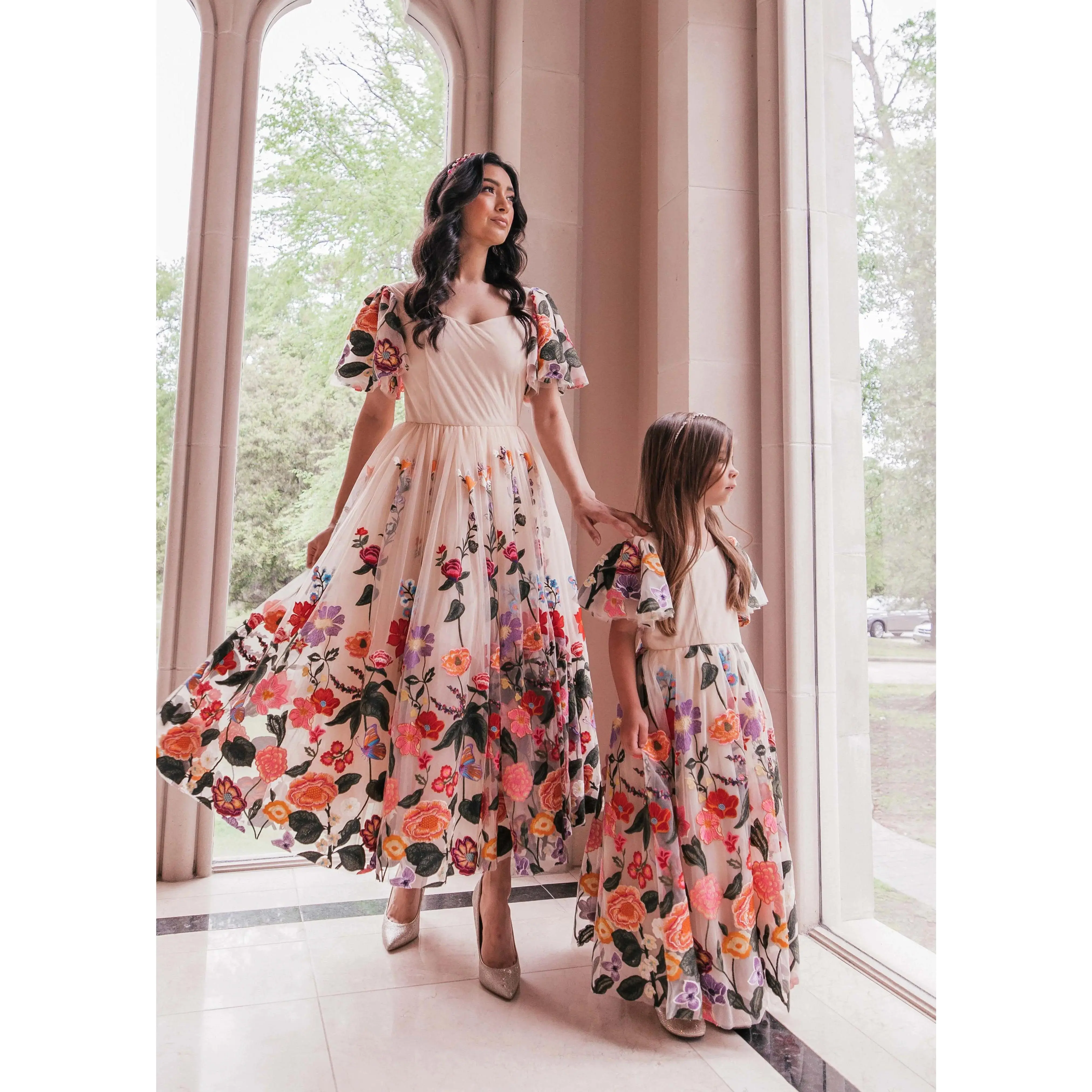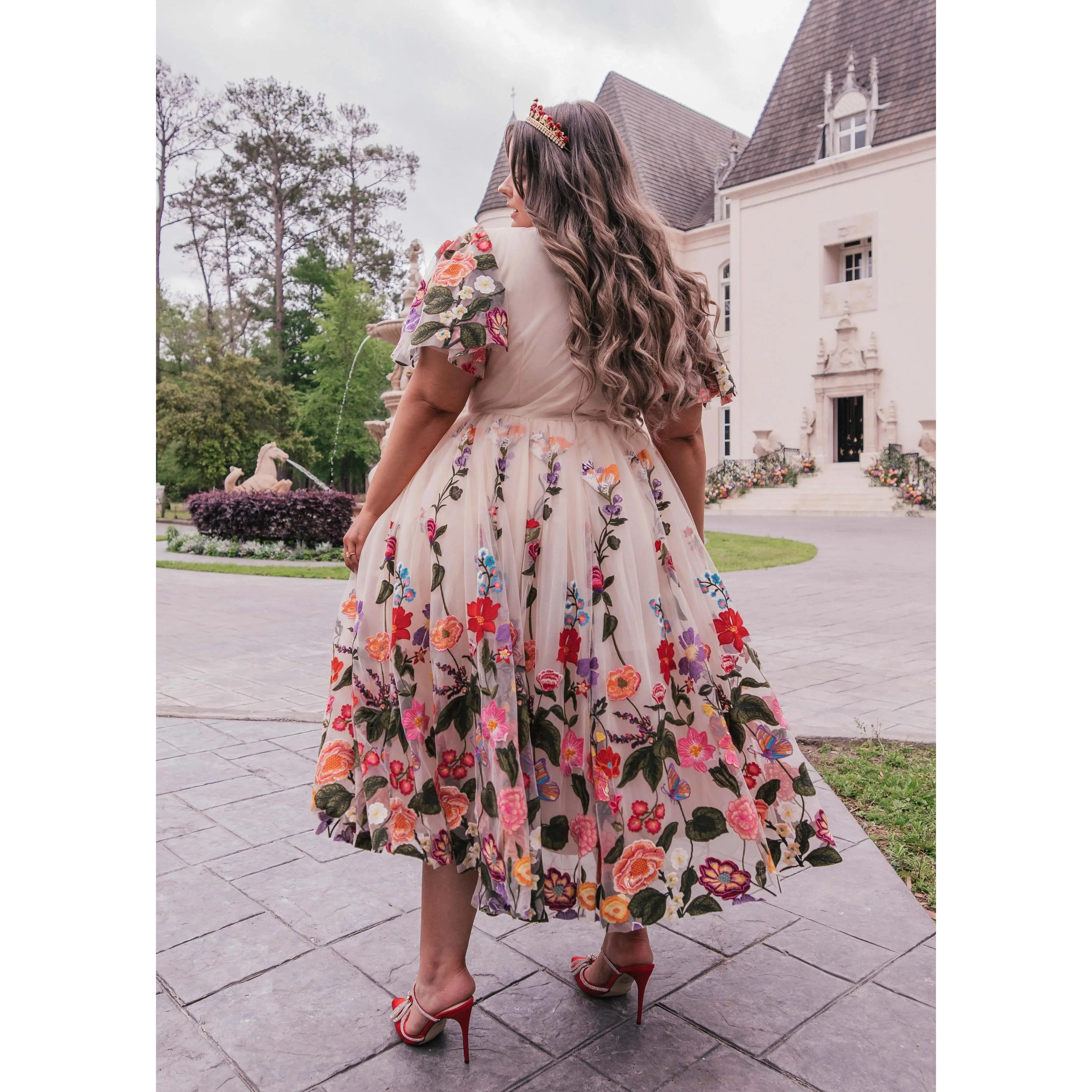 This regal princess dress is blooming with beauty - sweet floral and butterfly embroidery dances along the skirt and flutter sleeves. We can't wait to see you twirl in this one.