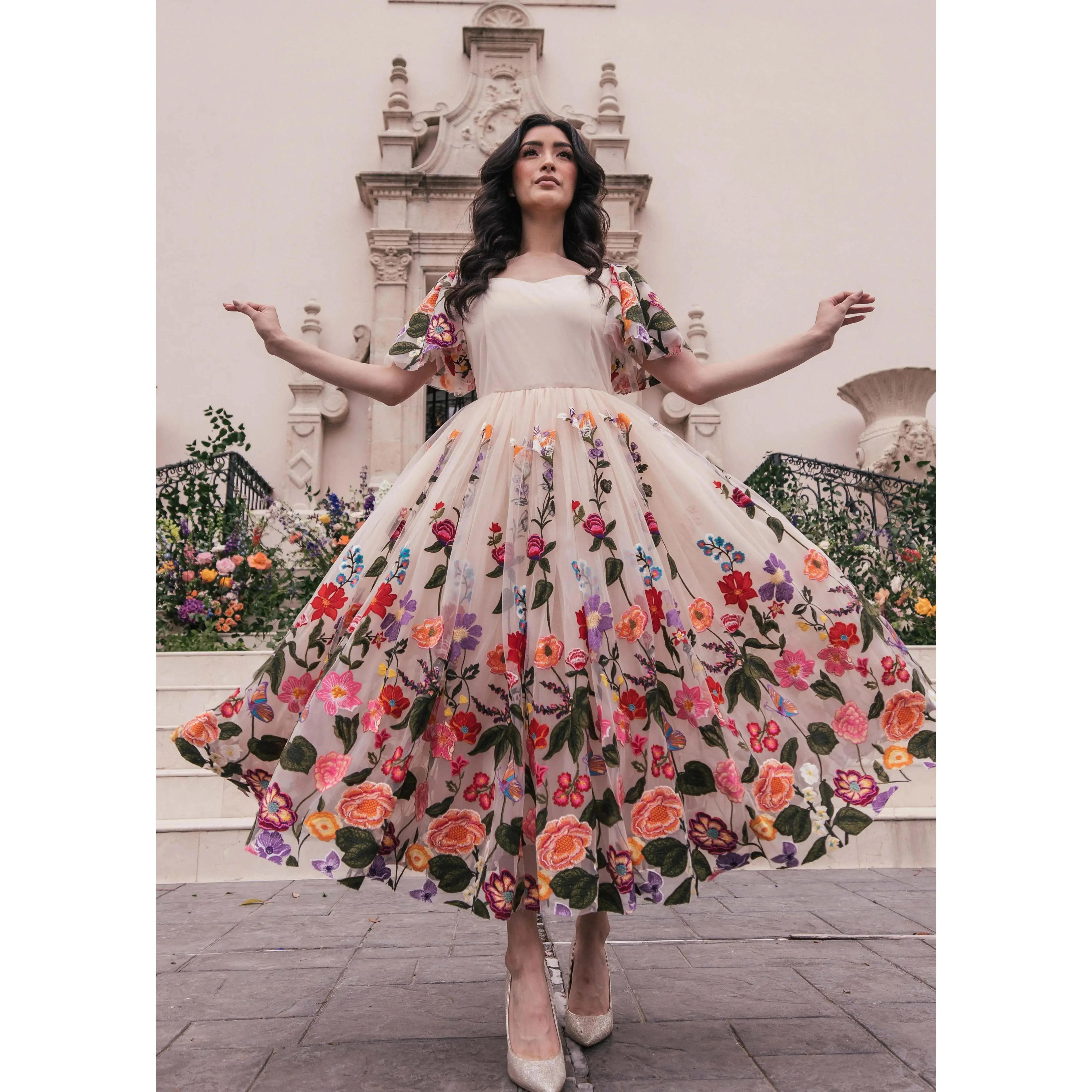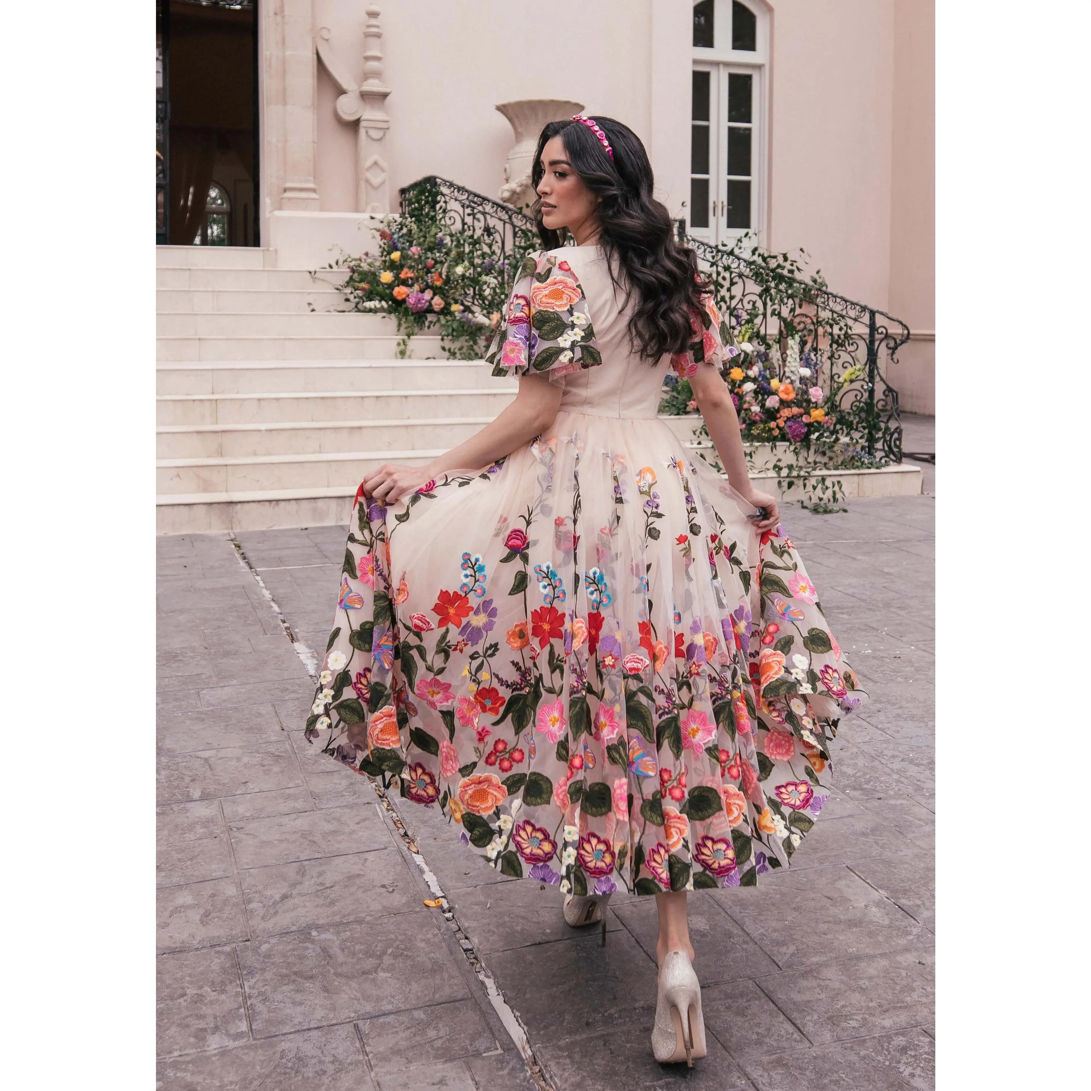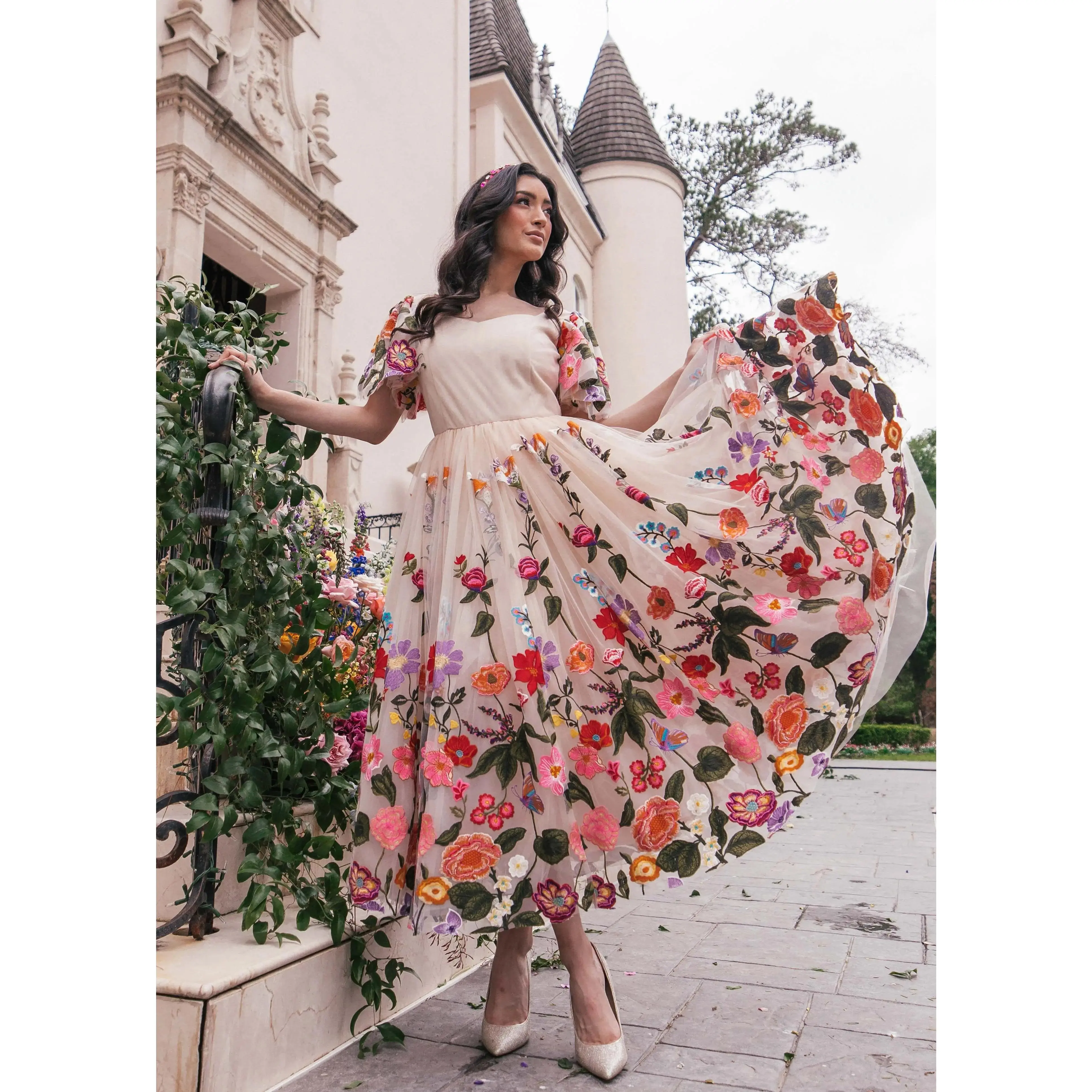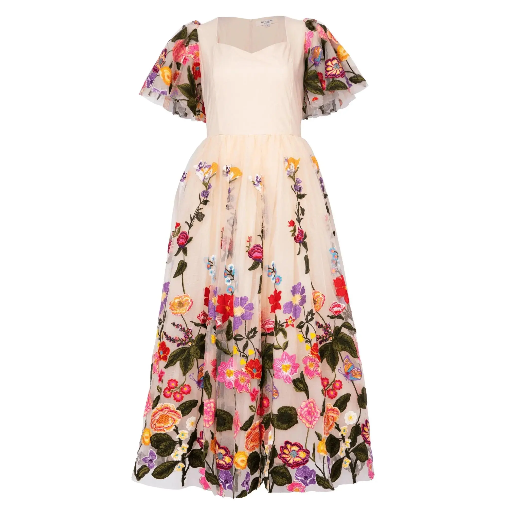 This regal princess dress is blooming with beauty - sweet floral and butterfly embroidery dances along the skirt and flutter sleeves. We can't wait to see you twirl in this one.