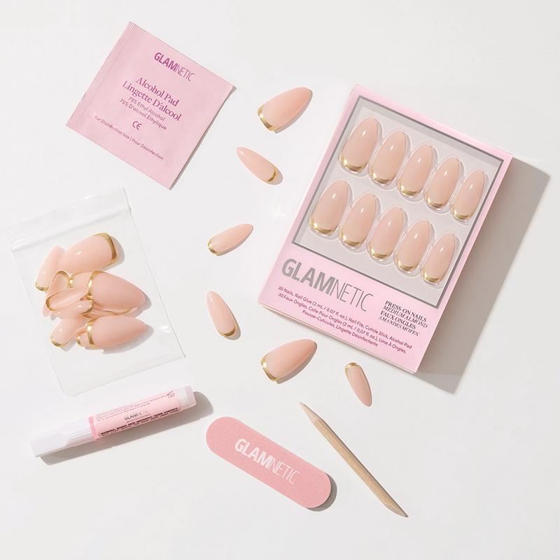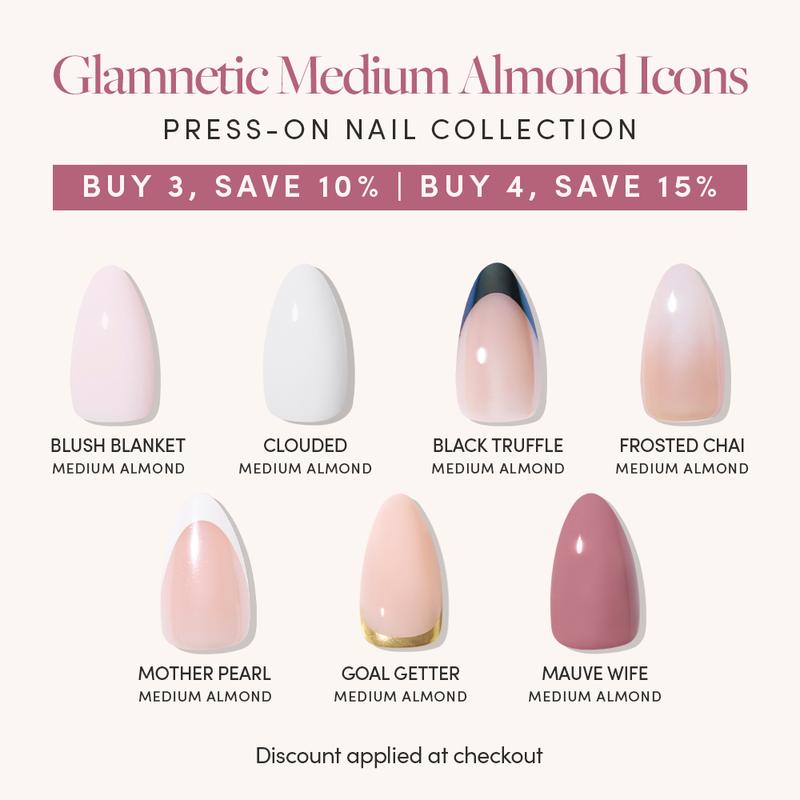The Medium Almond Glam Icons Collection includes 7 medium almond press-on sets that reimagine our most-loved timeless designs in an elegant, elongating silhouette. From French tips to soft shades and milky manis, every style feels sleeker and more refined in this graceful shape. Durable, long-lasting, and effortlessly salon-quality, these medium almond manis don’t shy away from its icon status.