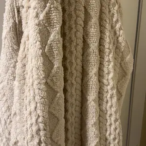 really nice soft fuzzy material. Fits true to size a little bit bulky feeling, but it’ll be great on those chilly afternoon afternoons.