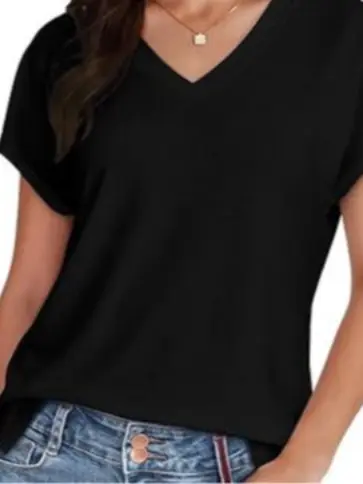 Women's V-Neck Short Sleeve Tee - Plain Black Color, Casual Wear, Comfort Fit, V-Neck Cutout, 34dsd