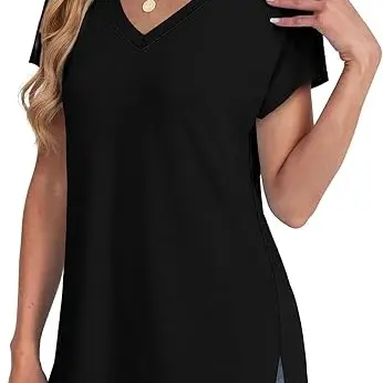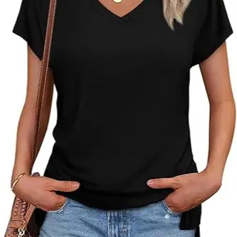 Women's V-Neck Short Sleeve Tee - Plain Black Color, Casual Wear, Comfort Fit, V-Neck Cutout, 34dsd