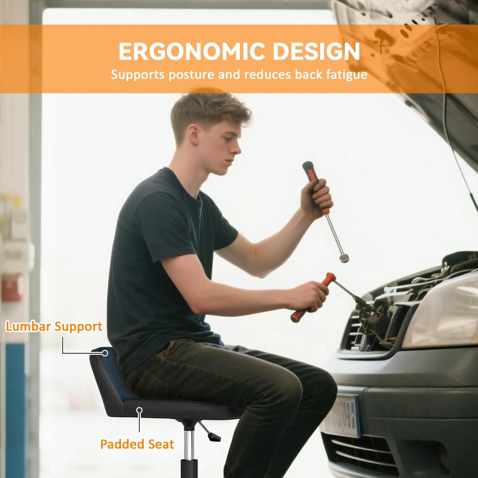 Revolutionize your workspace with the HOMCOM Rolling Shop Stool! This stool provides superior comfort and support, allowing you to sit comfortably instead of squatting. It features a 300 lbs weight capacity, ensuring secure seating for most adults. Perfect for long hours in the garage or workshop.