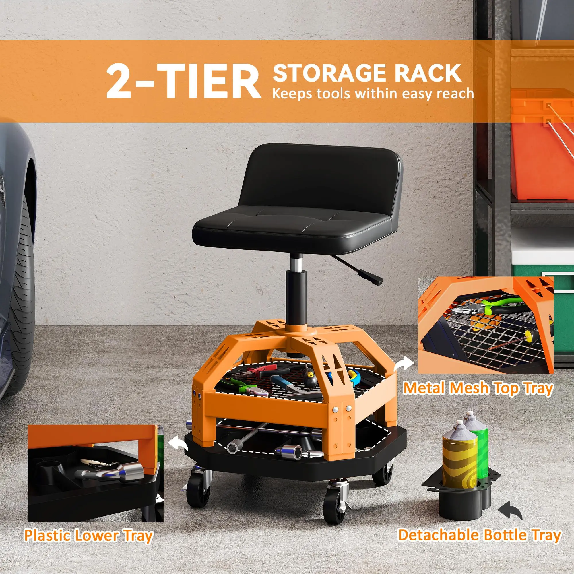 ·Backrest & Tool Tray: Offers additional support and storage for tools.
