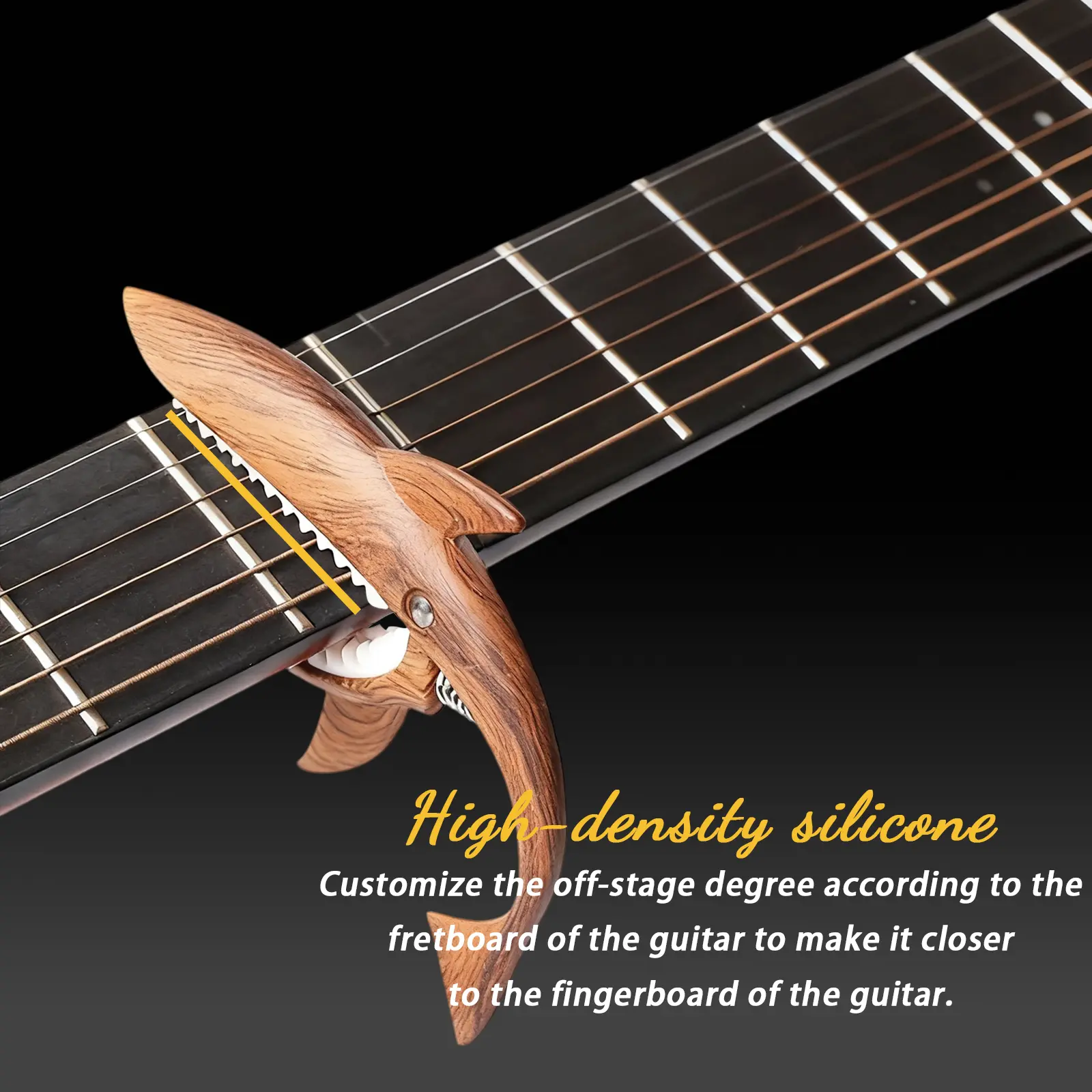 • The shark capo boasts a sleek and edgy design that adds a touch of modern flair to your guitar playing. Its unique appearance not only makes it a functional accessory but also a fashionable statement on stage or in pratice.