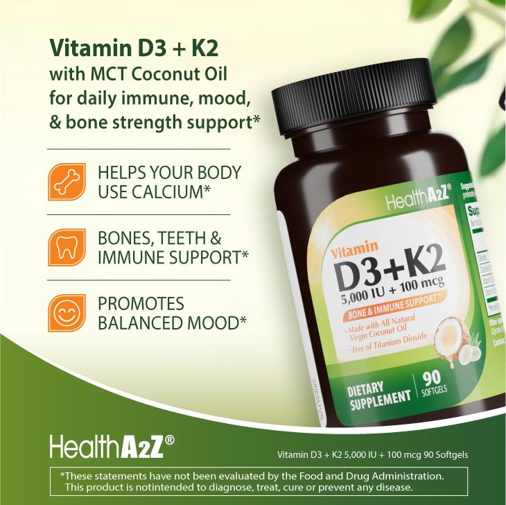 ·HealthA2Z Vitamin D3 (5,000 IU) + K2 (Made with Virgin Coconut Oil) supports immune balance and whole-body wellness, helping you feel steady and strong, especially during low-sun or high-allergen seasons.
