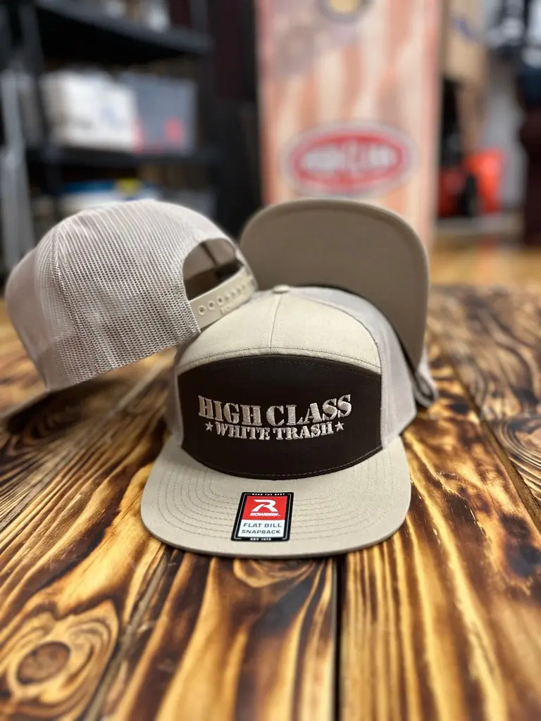 A modern seven-panel trucker, the 168P features a flat bill and Hi Pro shape. This cap has a seamless front panel decorated with direct embroidered High Class White Trash brand logo in sand color matching thread.