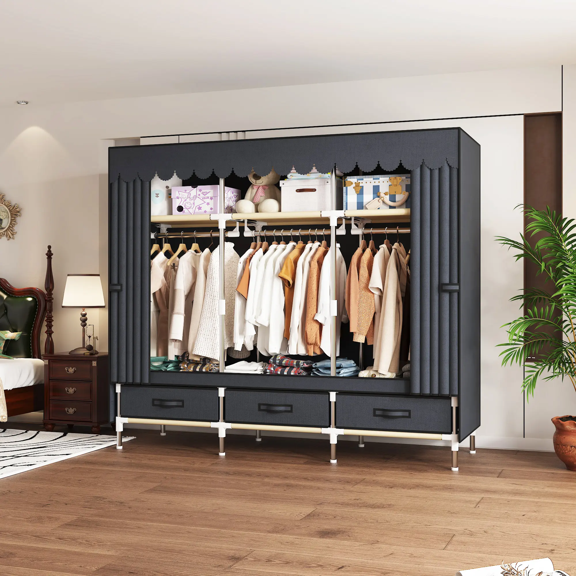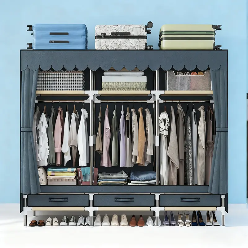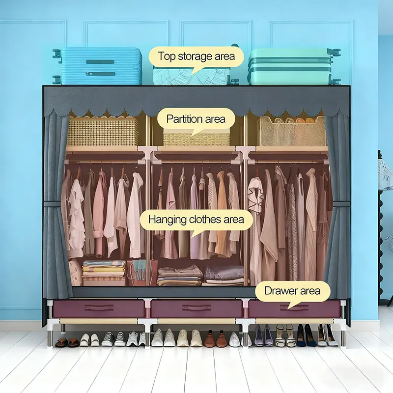 This organizer features a sturdy 16mm metal frame, ensuring durability. It includes 3 cubes, 3 hanging areas, and 3 drawers, offering versatile storage options. Perfect for quilts and pillows, it keeps your closet dust-proof. Ideal for small spaces, this organizer provides efficient storage solutions.