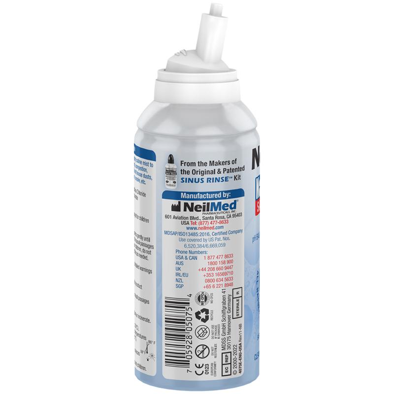 NasaMist Isotonic Saline Spray is a sterile natural soothing saline spray. Applying a gentle fine mist in the nose is an excellent way to keep the nasal passages moist. NasaMist Saline Spray comes in isotonic, pediatric, and hypertonic concentration. Nasal sprays should not be mistaken for large volume irrigation systems like Sinus Rinse™ Nasal Wash. Use For Nasal Allergies and Dryness Sinusitis, Rhinitis Allergic Asthma Post Nasal Drip Sinus Pressure & Nasal Congestion Nasal Symptoms from Flu and Cold Nasal Irritation from Occupational and House Dust, Fumes, Animal Dander, Grass, Pollen, Environmental Pollutants and Smoke