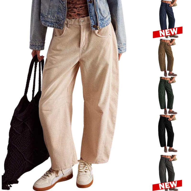 These women’s corduroy pants are designed for effortless comfort and style. With a soft elastic waistband and secure button closure, they sit comfortably at the mid-rise, giving you a relaxed fit that’s easy to wear all day. The four-pocket design and belt loops add everyday practicality, while the vintage barrel leg creates a modern wide-leg silhouette that tapers gently at the ankle.
