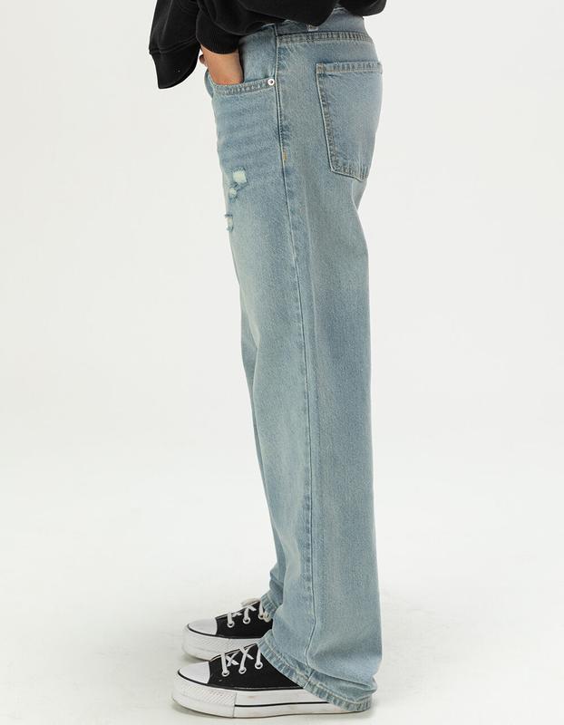 RSQ Low Rise Loose Straight Jeans. The RSQ Low Rise Loose Straight Jeans for women deliver a laid-back, vintage-inspired vibe with modern comfort. Crafted in a light wash with subtle rips at the left leg and light fraying for a lived-in look, these jeans feature a classic 5-pocket design, button closure with zip fly, and belt loops for easy styling. The low-rise waist and loose, straight-leg fit create a relaxed silhouette, finished with a 16in leg opening that pairs perfectly with sneakers, boots, or sandals for effortless everyday wear. 100% Cotton. Machine wash. Imported.
