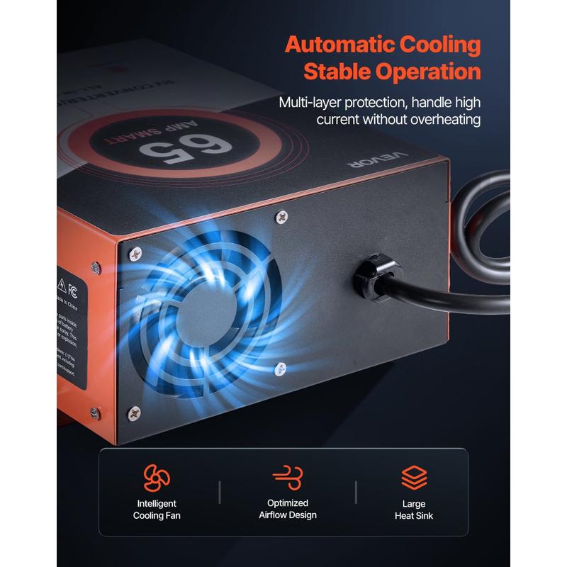 Features multi-stage charging to extend battery life. The intelligent cooling fan activates when the temperature exceeds the rated limit. Metal housing aids in heat dissipation.