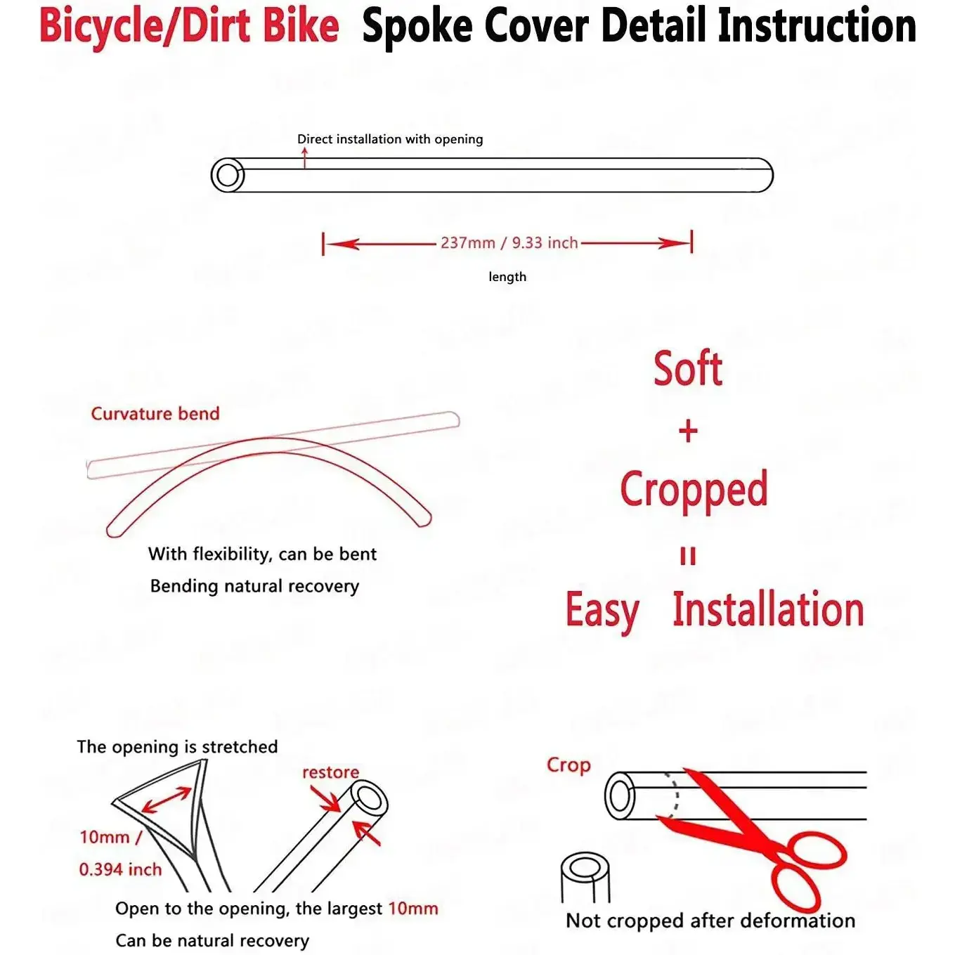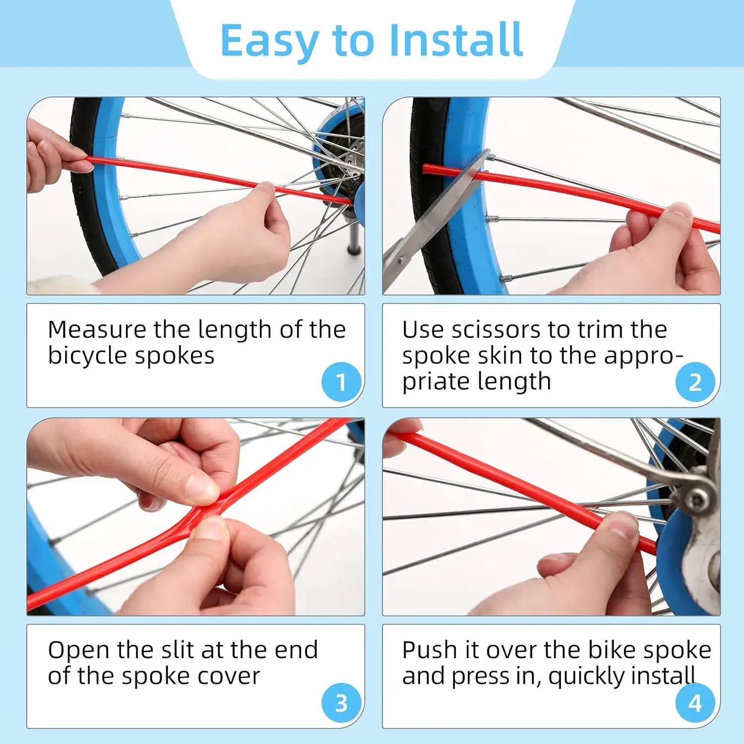 ·Easy to Install and Remove: No Glue or Special Fasteners are Required. Just Measure the Length of the Spoke and Cut the Spokes Covers to the Suitable Size, and then Open the Slit on the Side of the Spoke Cover and Press it in Spoke.
