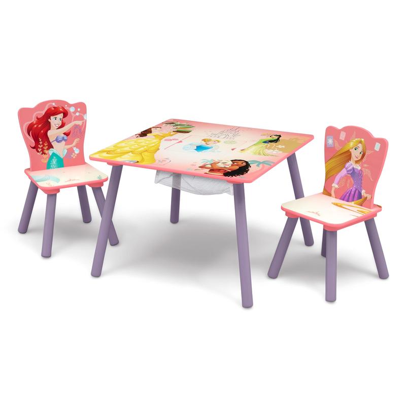 Bring royalty home with this Disney Princess Table and Chair Set with Storage by Delta Children. Featuring colorful graphics of Cinderella, Ariel, Moana, Belle, Mulan and Rapunzel, this table and chair set will spark imaginations. Making any activity extra-special, this kids table and chair set features a table and two chairs, designed at the perfect kid-sized height, making it ideal for snack time, playtime or homework. Plus, a built-in storage compartment at the center of the table provides the perfect space to keep art supplies.
