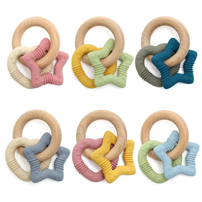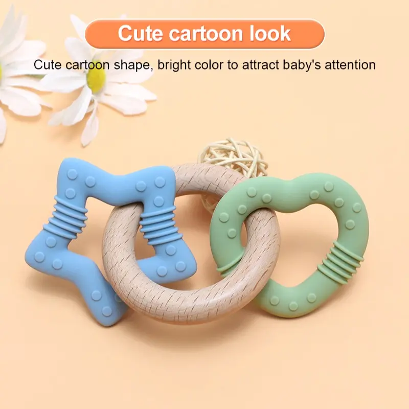 Baby Silicone Wooden Teething Toy, Heart Star Multi Texture Chewable, Infant Soothing Teether, Anti-Sucking Educational Rattle Gift