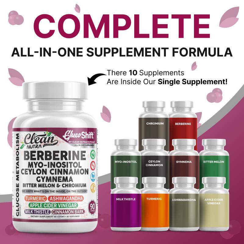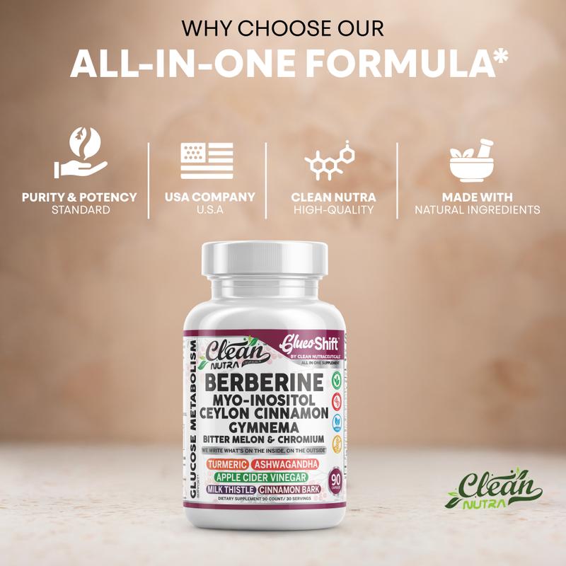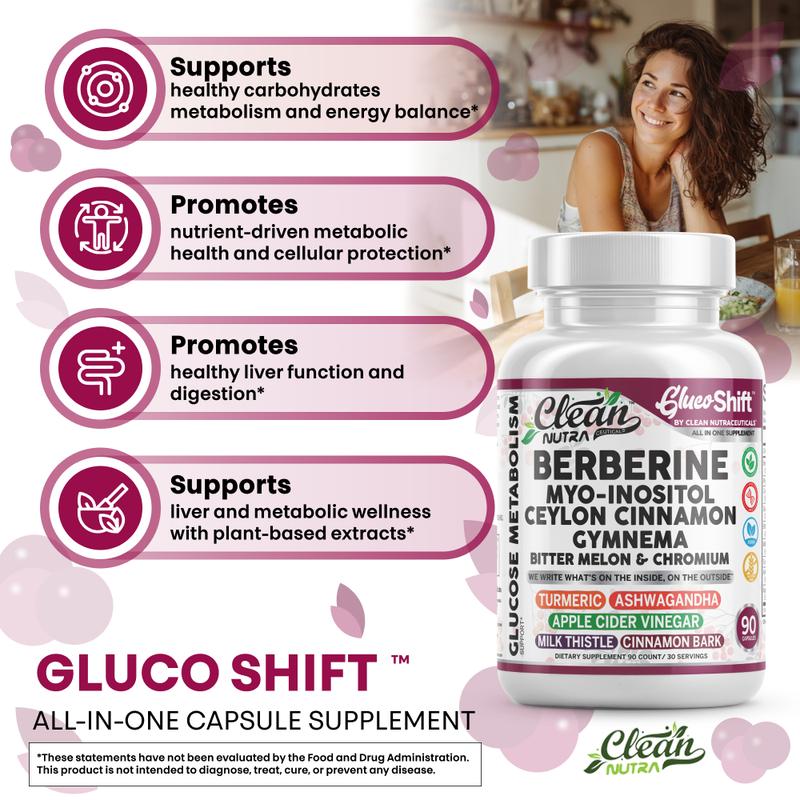 Clean Nutra Gluco Shift is a complete 10-in-1 metabolic support formula crafted to help promote healthy carbohydrate processing, energy balance, and overall wellness. This daily supplement combines berberine, myo-inositol, ceylon cinnamon, bitter melon, gymnema, chromium, turmeric, milk thistle, apple cider vinegar, and ashwagandha to support metabolic function, digestion, and balanced energy throughout the day.