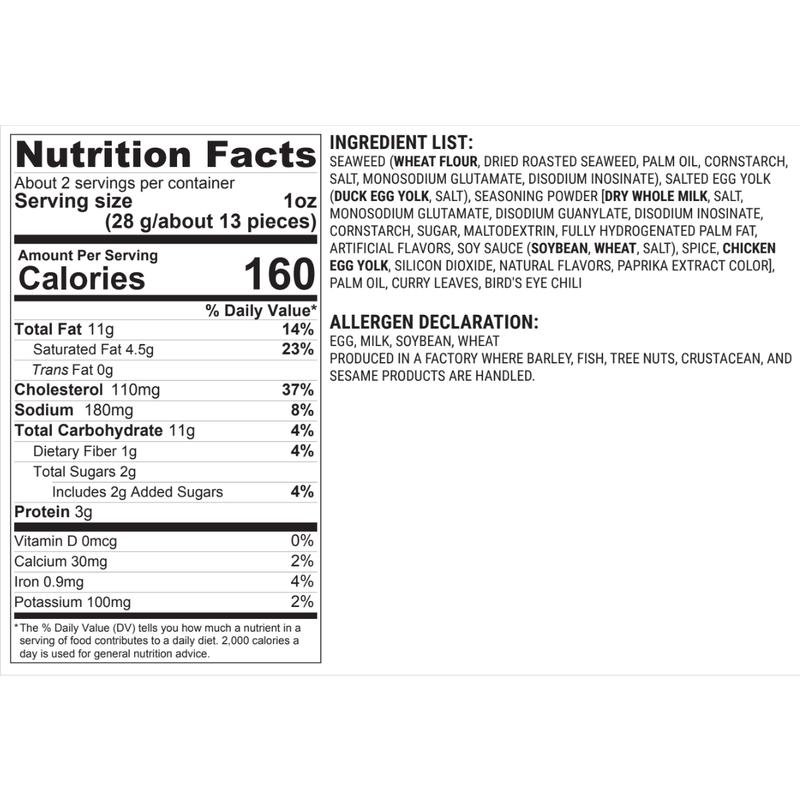 IngredientsSEAWEED (WHEAT FLOUR,DRIED ROASTED SEAWEED,PALM OIL,CORNSTARCH,SALT,MONOSODIUM GLUTAMATE,DISODIUM INOSINATE),SALTED EGG YOLK (DUCK EGG YOLK,SEASONING POWDER [DRY WHOLE MILK,DISODIUM GUANYLATE,DISODIUM INOSINATE,SUGAR,MALTODEXTRIN,FULLY HYDROGENATED PALM FAT,ARTIFICIAL FLAVORS,SOY SAUCE (SOYBEAN,WHEAT,SPICE,CHICKEN EGG YOLK,SILICON DIOXIDE,NATURAL FLAVORS,PAPRIKA EXTRACT COLOR],CURRY LEAVES,BIRD'S EYE CHILI