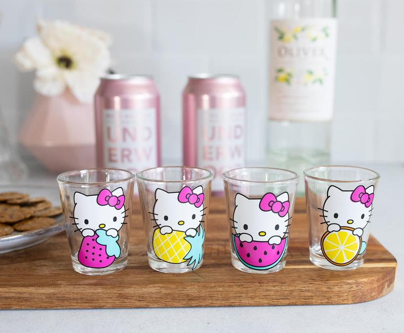 Show off your love of Sanrio's adorable Hello Kitty with this quality mini glass set! Each colorful 1.5 ounce mini glass features a unique Hello Kitty design. Set includes four (4) mini glasses. Durable glass construction. Produced by Silver Buffalo, a trendsetting housewares and home decor company based in the heart of New York City.
