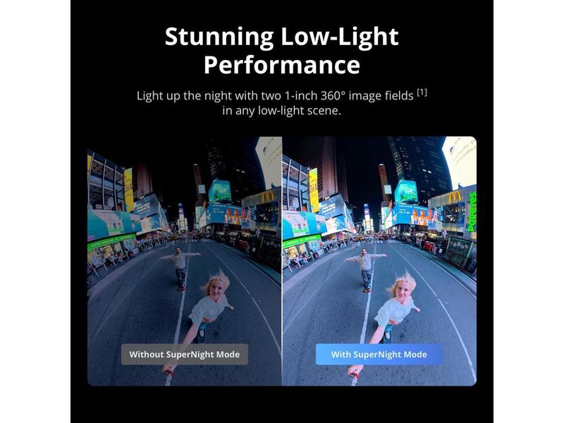: 1-Inch 360° ImagingSpecially designed for 360° capture, the all-new square HDR image sensor maintains the same 360° image field as a traditional 1-inch sensor, while increasing sensor utilization by 25%. This results in outstanding image quality and lower power consumption, all in an ultra-compact, lightweight camera body. Native 8K 360° VideoOsmo 360 is DJI's first camera to offer native 8K 360° video with large 2.4 μ m pixels. With an impressive 13.5 stops of dynamic range, it captures sharp, vibrant footage— even in high-contrast scenes like city nights or during sunrise and sunset. And with up to 8K/50fps ultra-high-spec 360° video, Osmo 360 sets a new standard for 360° cameras. 4K/100fps High-Frame-Rate 360° VideoCapture every split-second in stunning detail with Osmo 360's high-frame-rate 4K/100fps 360° video. Enjoy ultra-smooth, fluid visuals, and unlock up to 4x slow motion to make those fleeting, awe-inspiring moments last even longer. Stunning Low-Light PerformanceThe innovative square sensor design enables dual 1-inch 360° image fields, while the large f/ 1.9 aperture dramatically increases light intake. Even in low-light settings, you'll capture crisp, detailed footage with flagship-level quality.