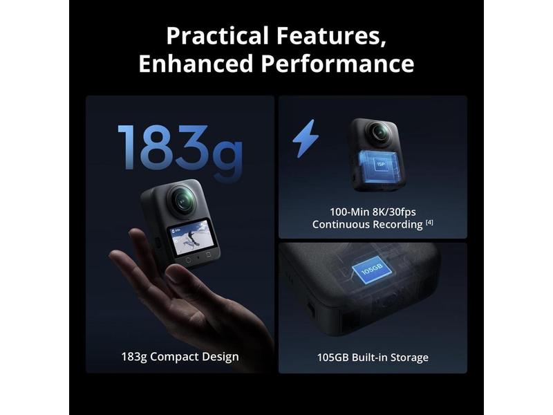 : 1-Inch 360° ImagingNative 8K 360° Video & Exceptional Low-Light Performance120MP 360° PhotoOsmo Magnetic Quick-Release Ecosystem4K/120fps & 170° Boost VideoOsmoAudio Direct Microphone Connection100-Min 8K/30fps Continuous Recording10-bit & D-Log M