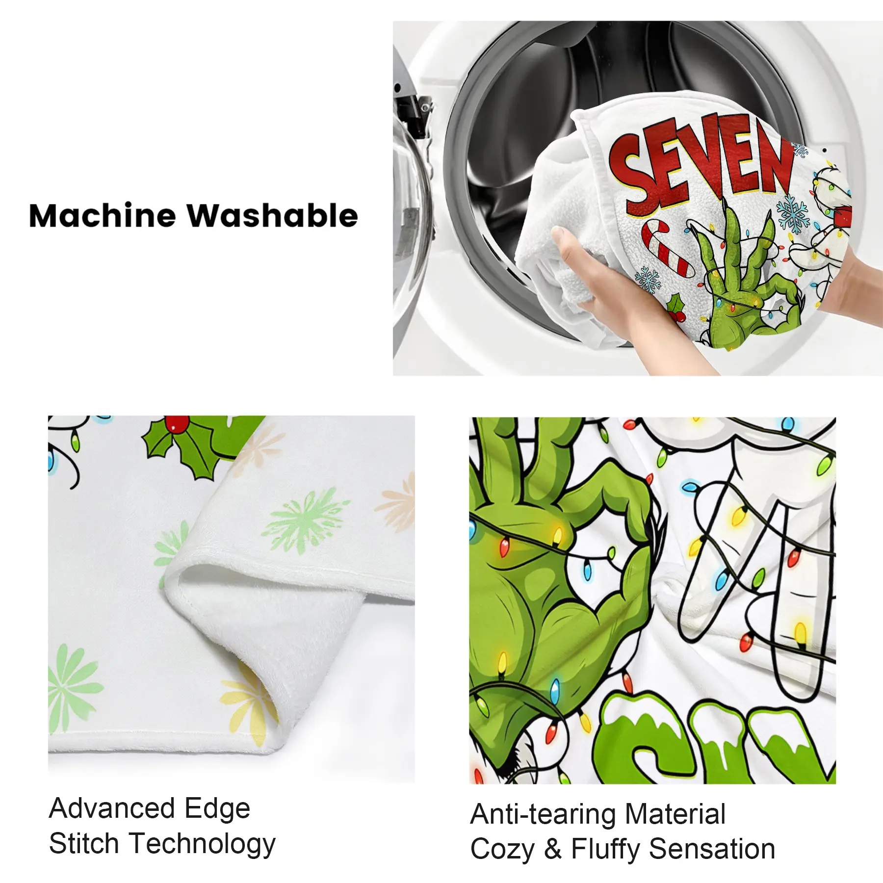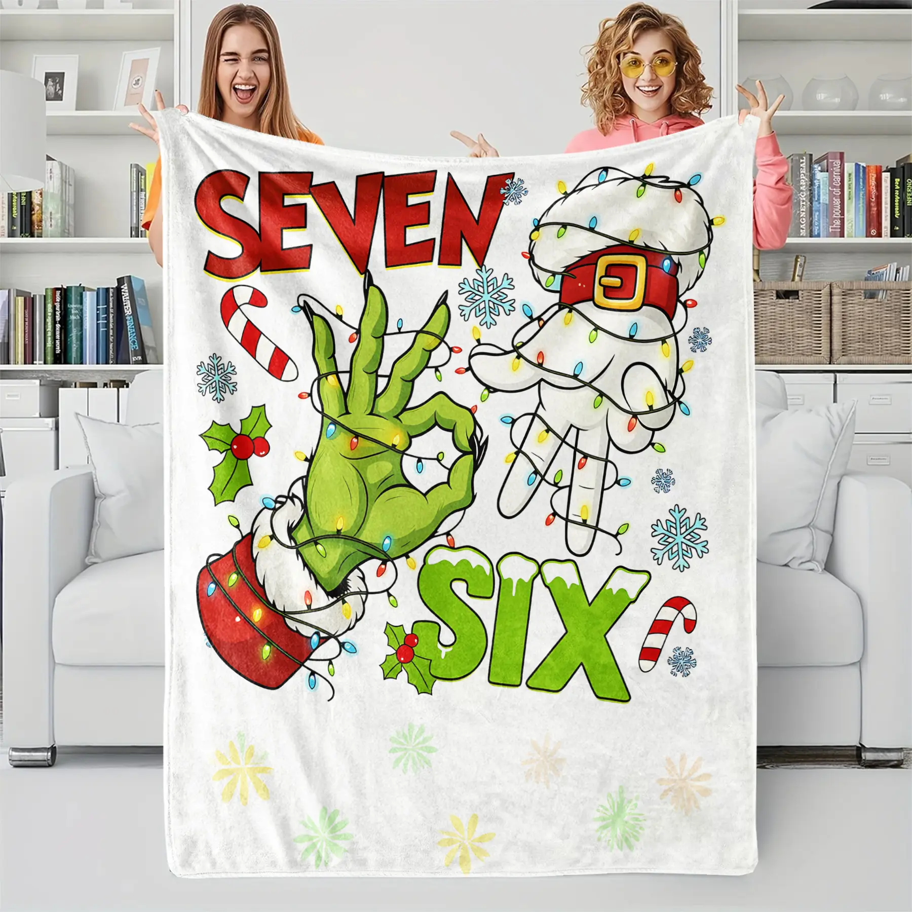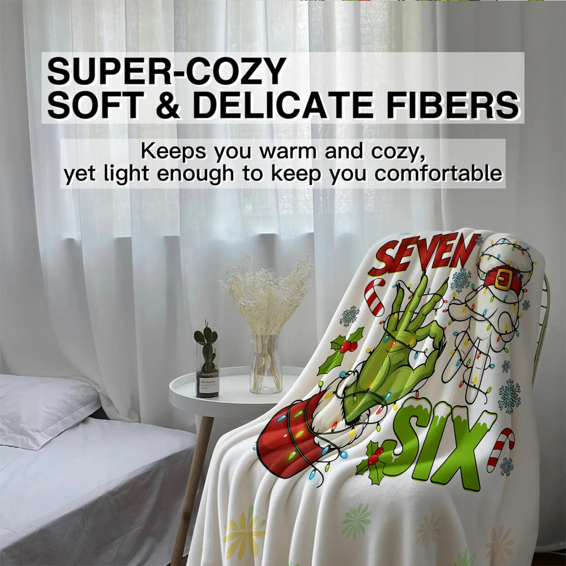 Christmas Cheer Flannel Blanket, Festive Holiday Throw Blanket with Colorful Grinch Hand and Bold 'SEVEN' and 'SIX' Text, Cozy Warm Cover for Home, Perfect Gift for Holiday Celebrations and Winter Naps