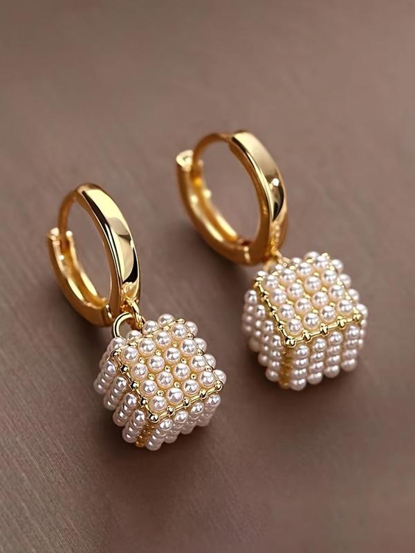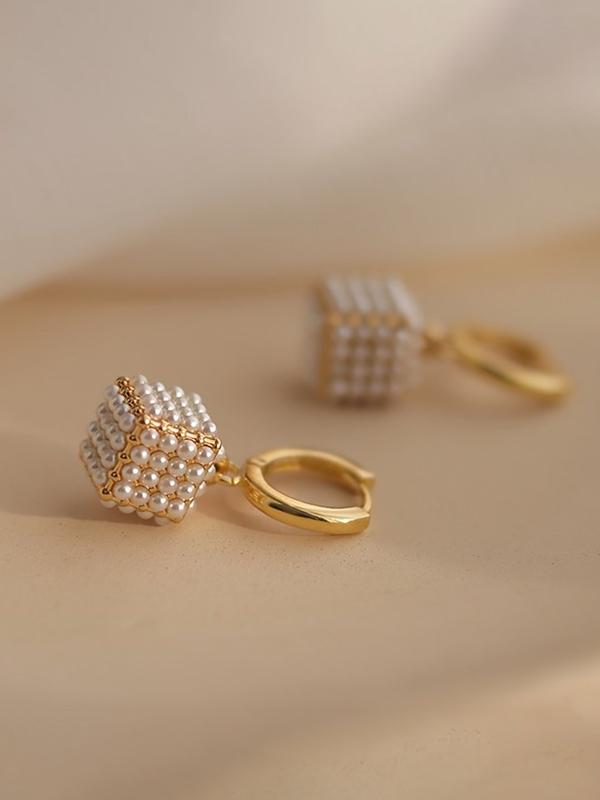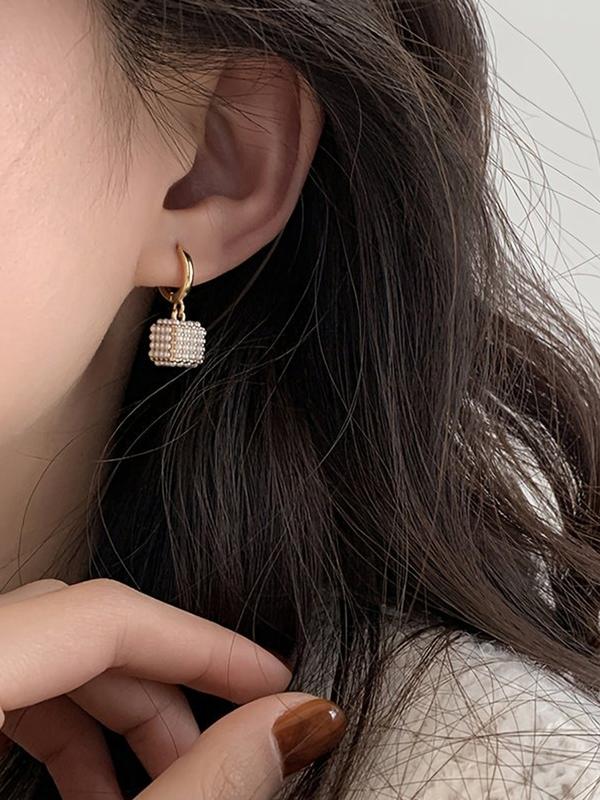 French Vintage Geometric Square Faux Pearl Earrings, Simple Elegant Design, Unique Ladies' Daily Wear Party Jewelry, High Quality Earrings