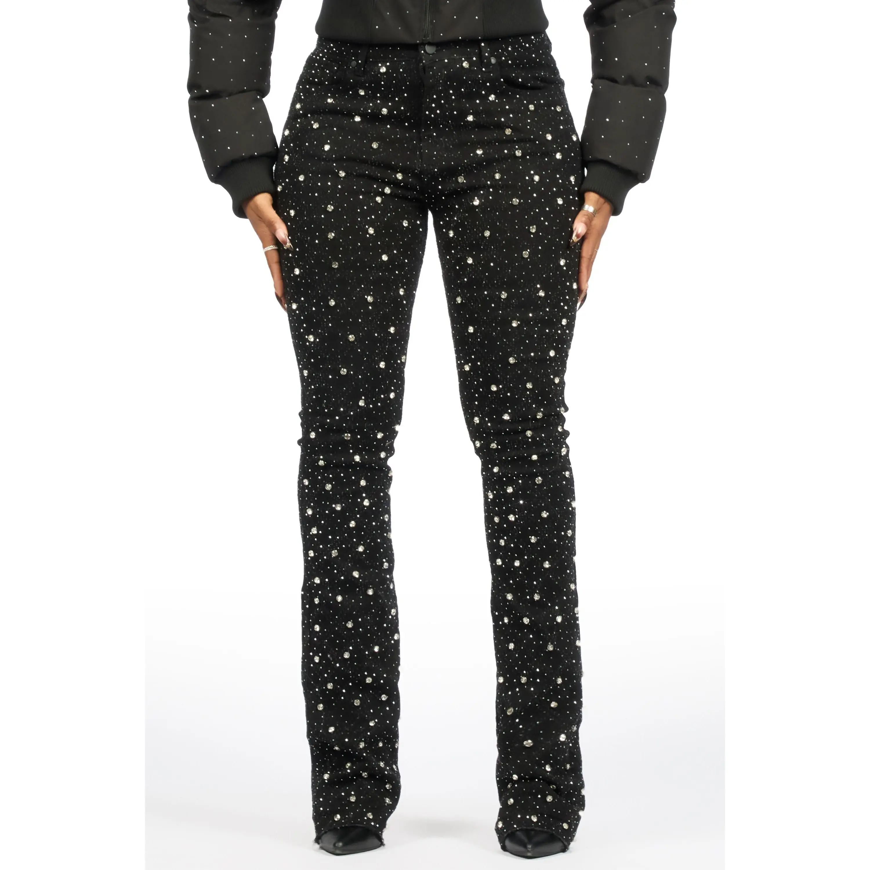 An urban stacked flare denim jean for women in black and silver. Designed with custom rhinestone detailing and extra long legs for a must-cop streetwear staple piece.