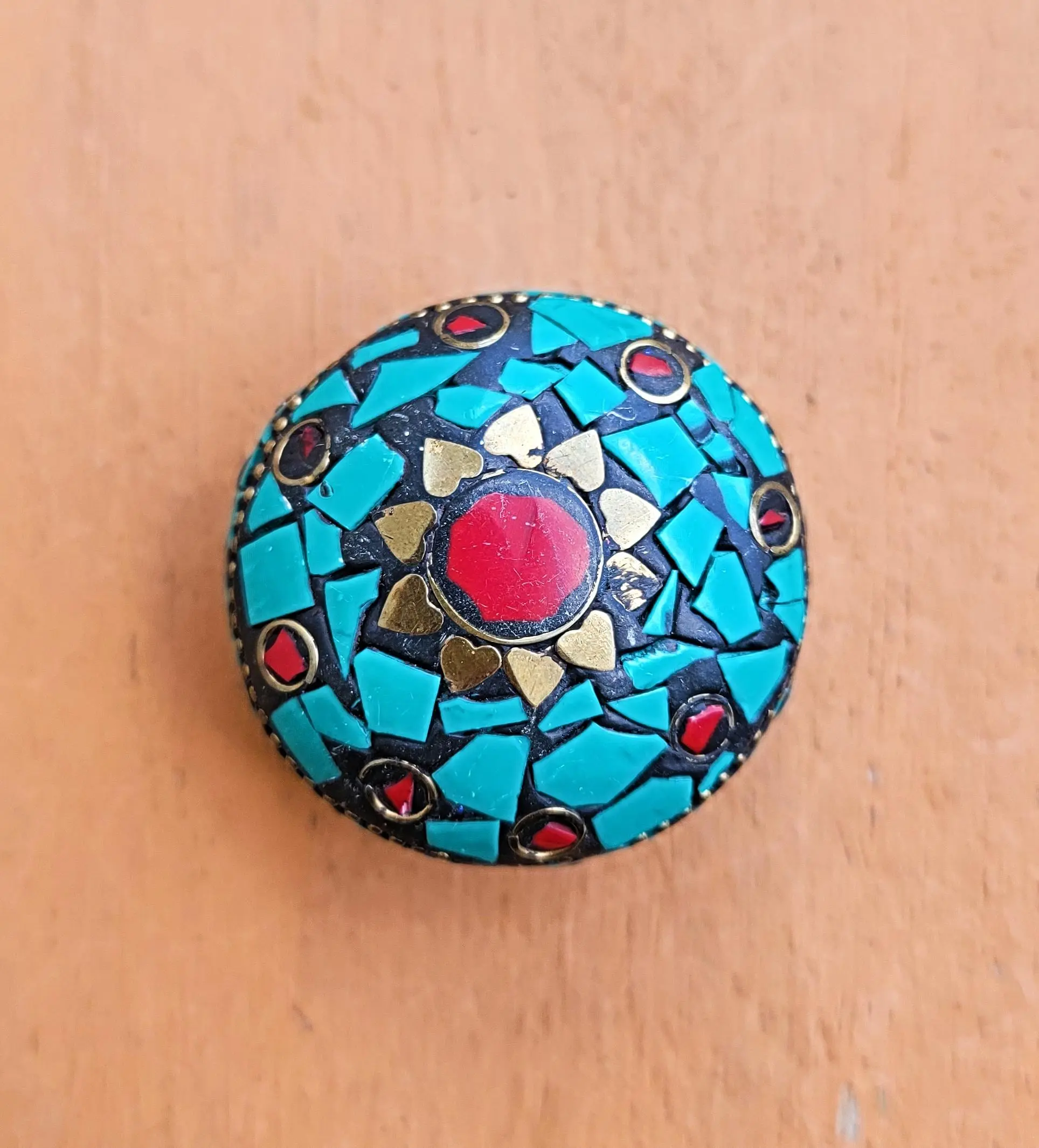 Tibetan handicrafts-jewerly box. *made of copper alloy. *hand crafted *inlaid blue turquoise, red coral clips.