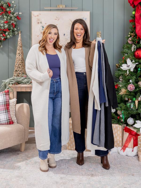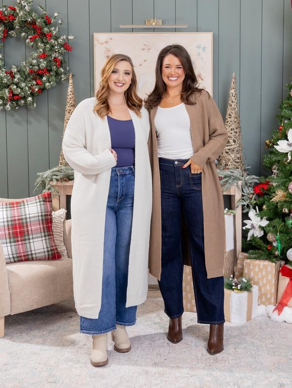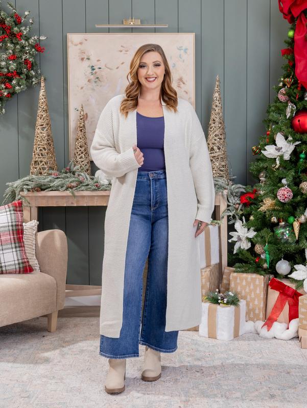 Fit/Sizing: True to size Maddy (brown hair) is 5’10, typically wears a size S in tops and 5 in denim. Wearing size S Erin (red hair) is 5'8, 36C bra, typically wears size L/XL in tops and 14/15 in denim. Wearing size XL Janel (short brown hair) is 5’1, typically wears a size S in tops and 0 in denim. Wearing size M, but would purchase a S Lauryn is 5’6, typically an L/XL in tops, XL in bottoms, 15 in denim, wearing a size XL Features: Long Sleeves, Open Front, Longline Medium Measurements: Bust-50"/ Length-45" 2XL Measurements: Bust-56"/ Length-48" Materials: 100% Polyester Brand: DD Designs sku65427