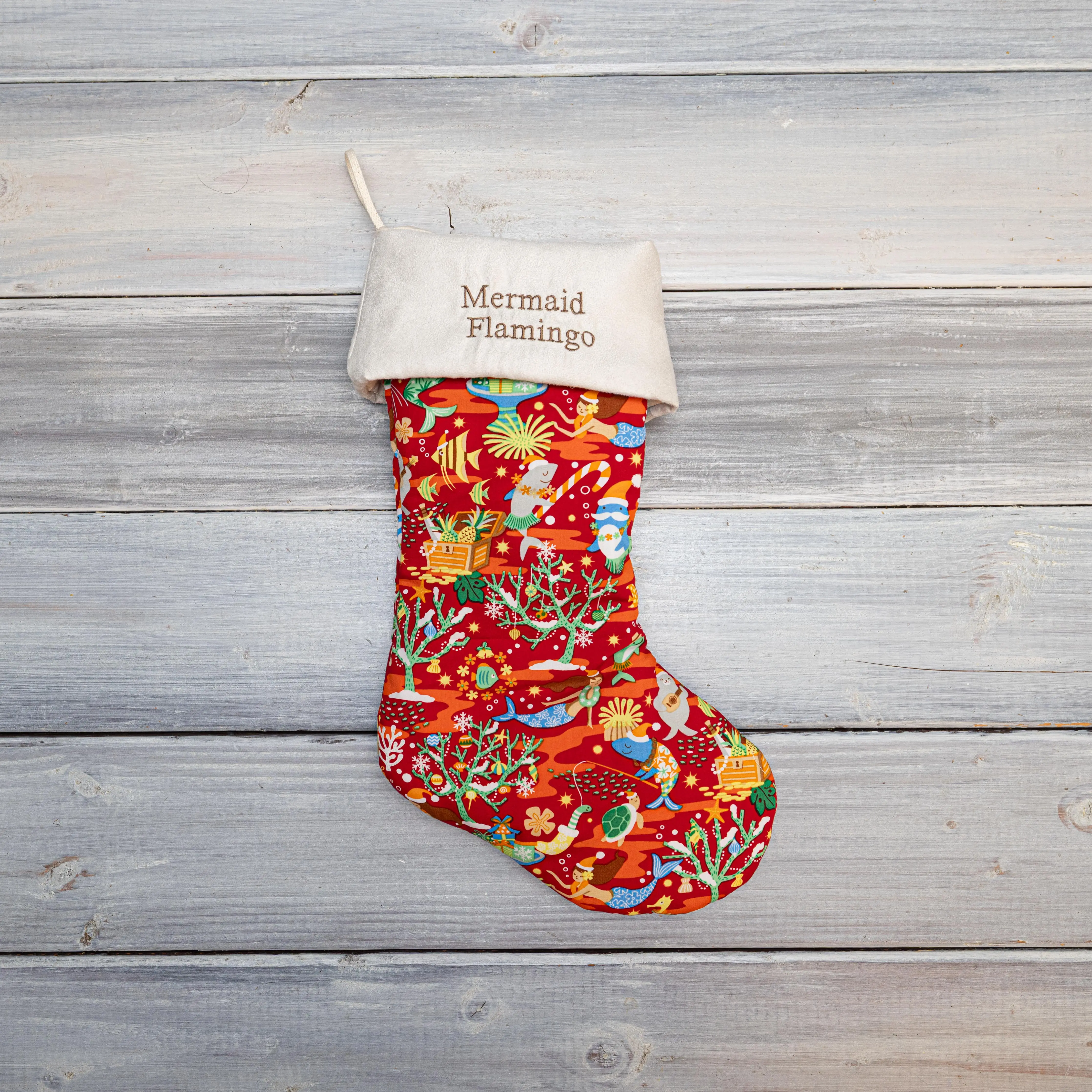Add seaside magic to your holiday mantel with our Mermaid Christmas Stockings, available in red, white, and ocean blue. Each stocking features a cuff with brown embroidery for a cozy, timeless touch.