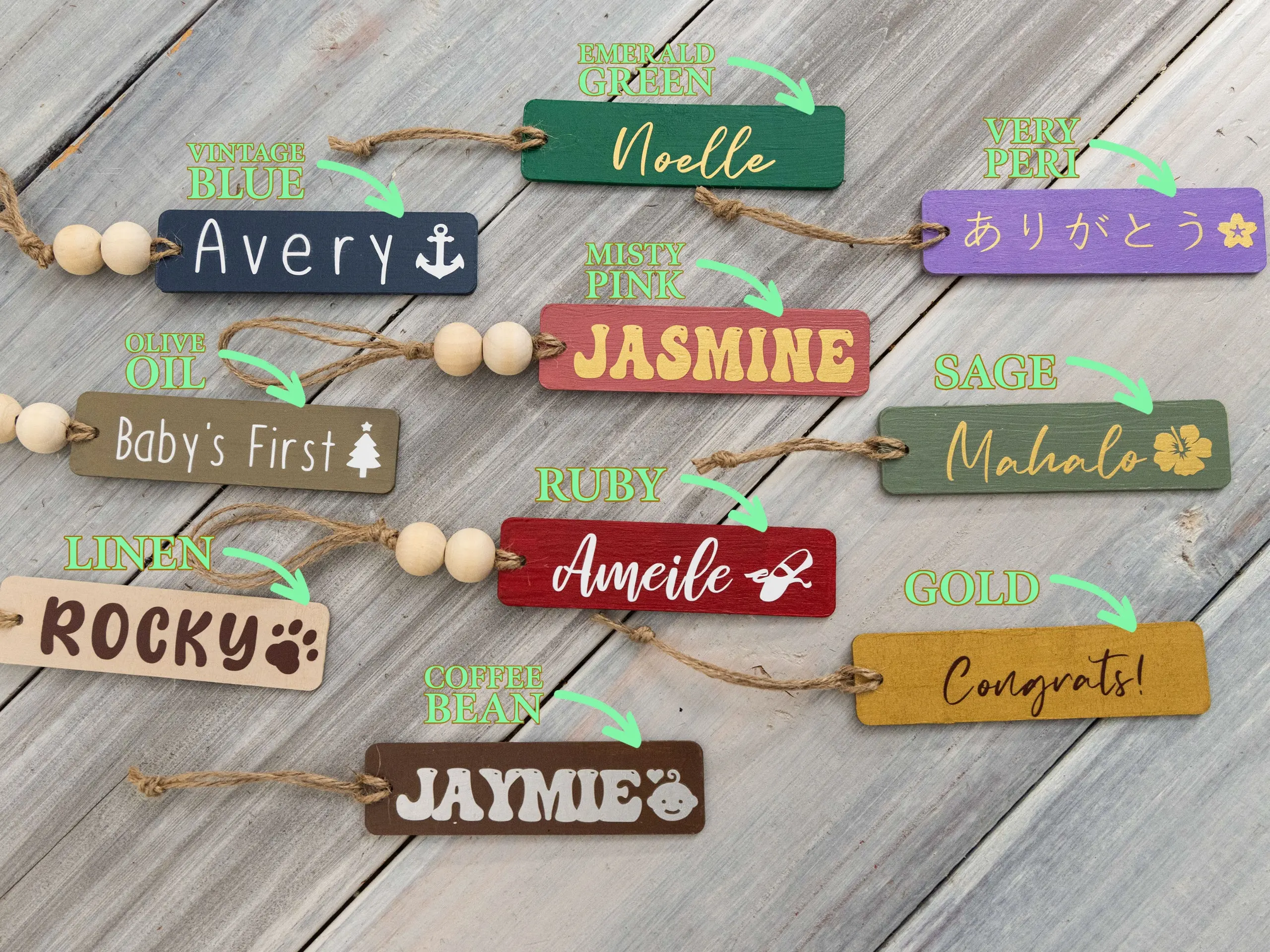 - Wooden tags with wooden beads. Tags are hand painted and names & icons are heat applied (HTV)