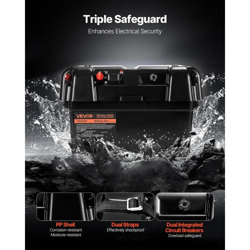 🛡️ Impact-Resistant PP Shell: The battery box features a corrosion-resistant and moisture-resistant PP shell. The dual strap design reduces shock and ensures stability. It includes dual-integrated circuit breakers for overload protection.