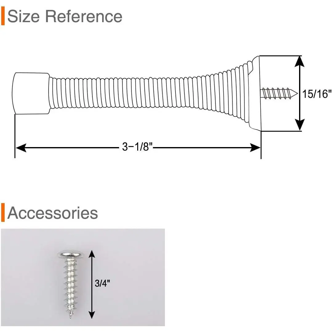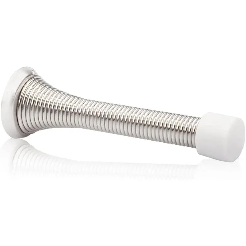 PREVENTS WALL MARKS & PROTECTS DOOR - This satin nickel spring door with rubber bumper will keep your wall and door protected.QUICK AND EASY TO INSTALL - First, mark where the stopper will go. Drill a hole. Unscrew the stoppers bottom to find the screw and drill a hole into the marked spot. Last, Screw the base mount to the wall and attached the door stopper. And voila, the door is ready for action!TOUGH DURABLE DESIGN - Our heavy duty satin nickel spring door stops are made of steel, and come individually wrapped to protect against any scratches.NOISE-CANCELLATION DESIGN - Our spring door stops keep the house peaceful, bringing you more comfort.RELIABLE QUALITY - If there is any quality problem, please feel free to contact us.