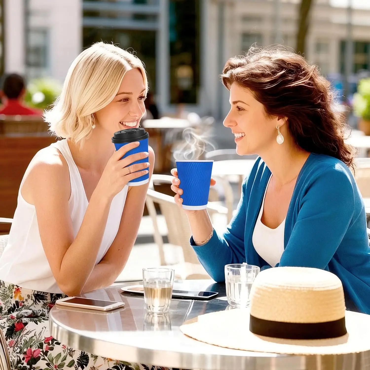 12oz two-tone disposable paper cups, 50-pack, includes lids and stirring straws. Crafted with triple-layer corrugated walls and a reinforced base, these cups offer 48-hour leak-proof protection and heat-resistant handling. Suitable for both hot and cold beverages, the BPA-free eco-friendly material makes them ideal for household and commercial use.