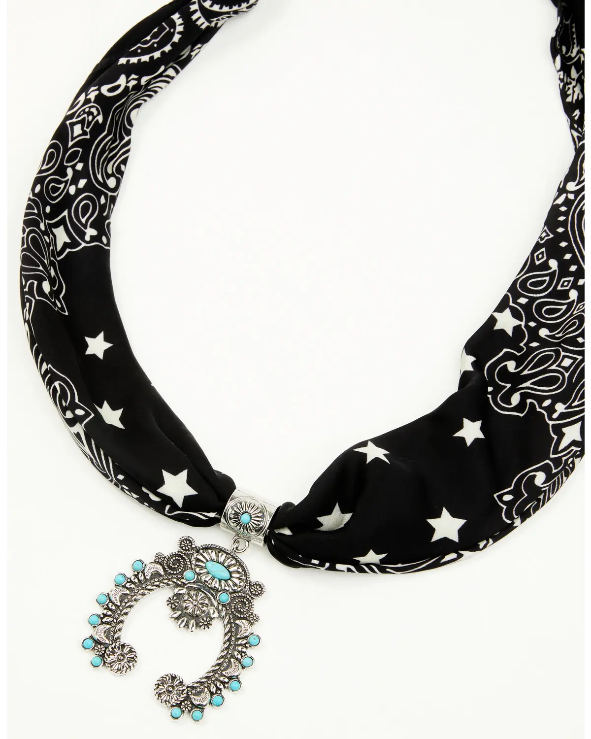 Black and white bandana. Silver-toned hardware. Intricate silver-toned squash blossom with turquoise-toned stone accents. Imported. One size fits most.