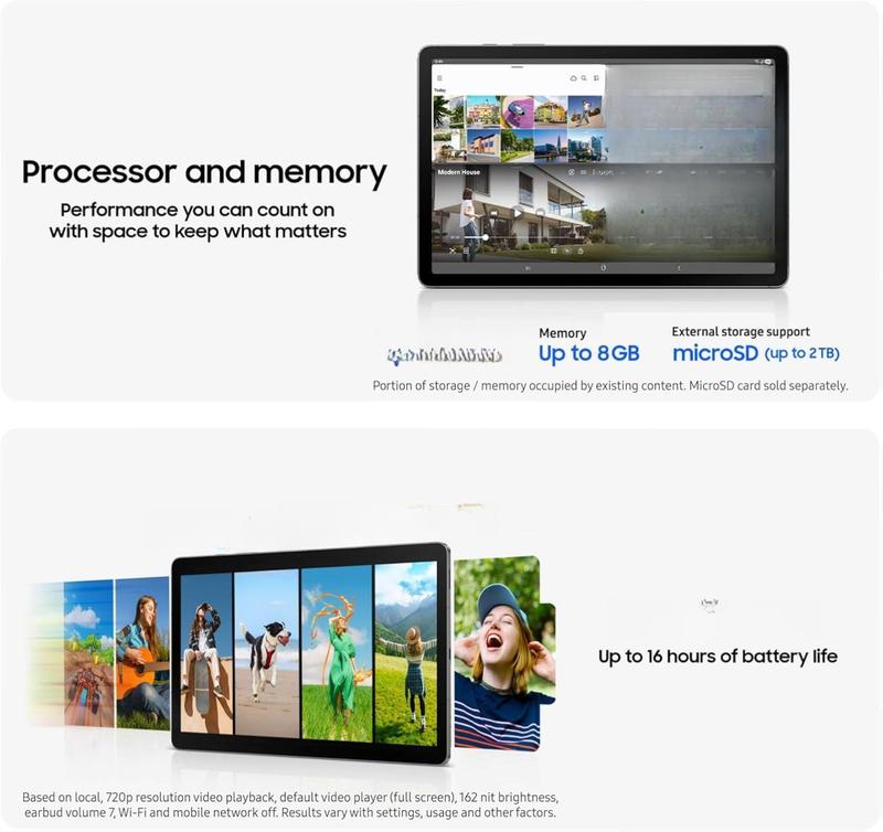 ·SPACE TO KEEP WHAT MATTERS MOST: More storage means deleting less apps, photos, videos and files. Galaxy Tab S10 Lite comes with up to 256GB³ of storage. And if you need even more, you can add up to 2TB with a microSD card.⁹
