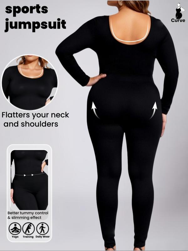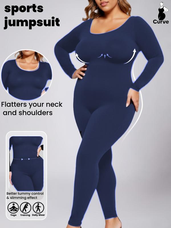 1 COUNT Women's Plus Size Slimming Long Sleeve Jumpsuit, Waist Cinching Yoga Pants, Casual Fall & Winter Sportswear,  Seamless Bodysuit,Stretch Skin-Friendly Fabric,Bottoms For Daily Wear #plussizesweatsuit #plussizeoutfitideas #plussizebirthdayoutfitideas #sportyjumpsuit #plussizeoveralls #tummycontrolleggingd #viralshapewearbodysuit #fullbodyshapewear #highwaistedtummycontrolshapewear #flatteringactivewear