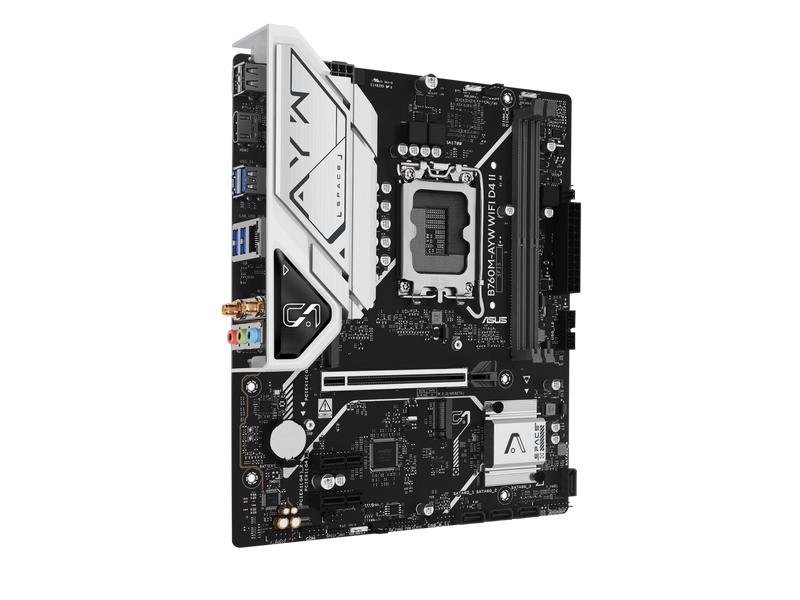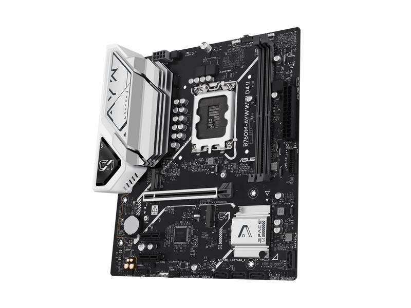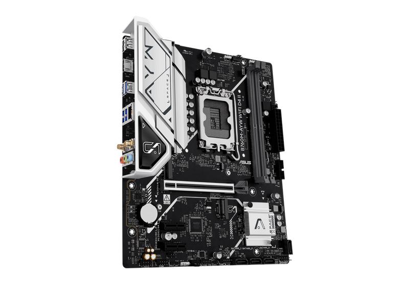 ASUS B760M-AYW WIFI D4 II Intel B760 (LGA 1700) microATX mATX motherboard, PCIe 5.0 x16 Support, two M.2 slots, DDR4, Realtek 2.5Gb Ethernet, Wi-Fi 6, HDMI, SATA 6 Gbps, front USB 5Gbps, Aura Sync
