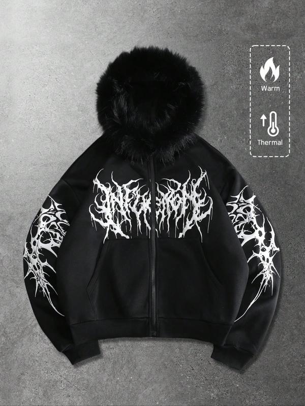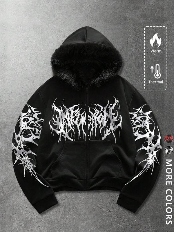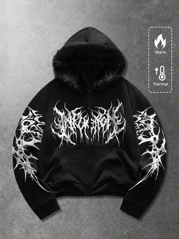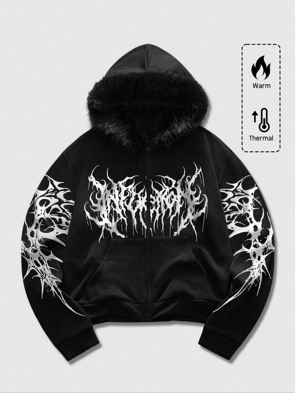 Unisex Y2K Gothic Angel Print Hooded Jacket, Hat with warm fleece lining,Fleece Lined, Zipper Design, Street Fashion, Warm and Stylish, Outdoor and Daily Wear