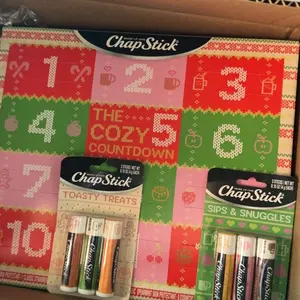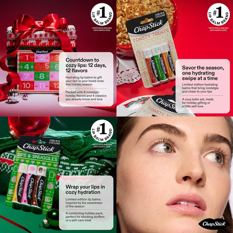 Celebrate the holiday season with the ChapStick Cozy Countdown Advent Calendar. This festive bundle also includes the Toasty Treats and Sips & Snuggles 3-packs—perfect for small Christmas gifts, Secret Santa surprises, teacher gifts, or stocking stuffers.