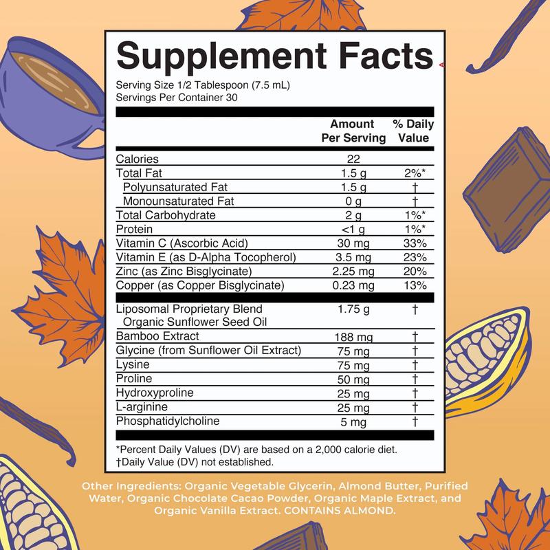 Important Nutrients: Vitamin C maintains normal collagen production, which supports connective tissue formation. Essential minerals copper and zinc also help support skin health. In addition to these ingredients, our Collagen Booster Liposomal also contains bamboo extract, lysine, glycine, proline, hydroxyproline, L-arginine, and phosphatidylcholine.