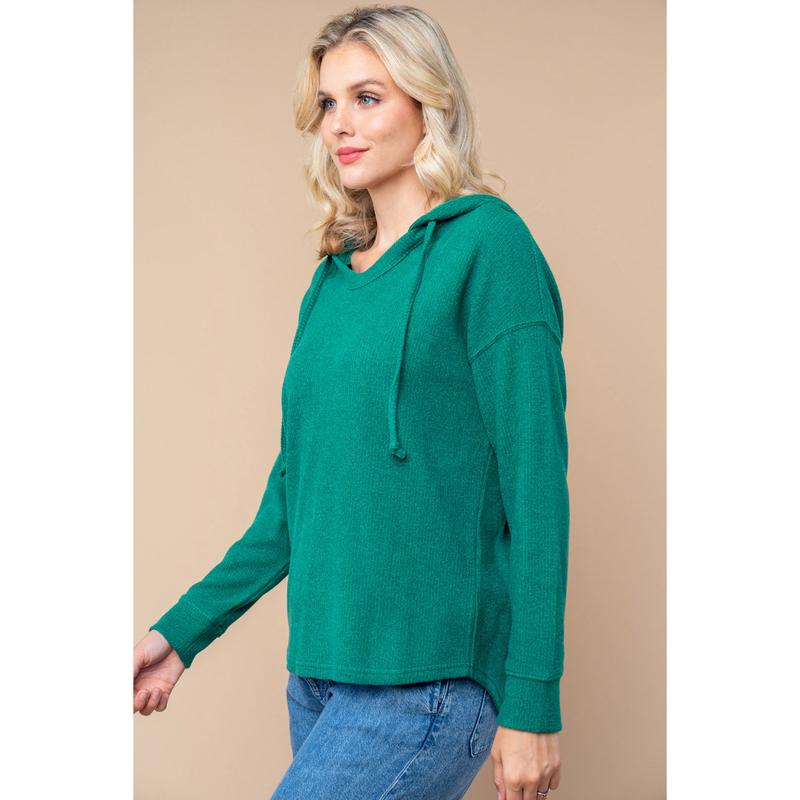 A long sleeve solid knit top with a hood featuring adjustable drawstrings and a true-to-size fit.