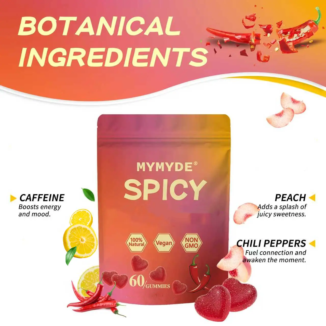 MYMYDE Spicy Gummy Hot Peach Flavor Edition 60 gummies containing chili peppers, maca root, mula puama, and horny goat weed 100% pure natural vegan non-GMO Healthcare Vitamin Dietary