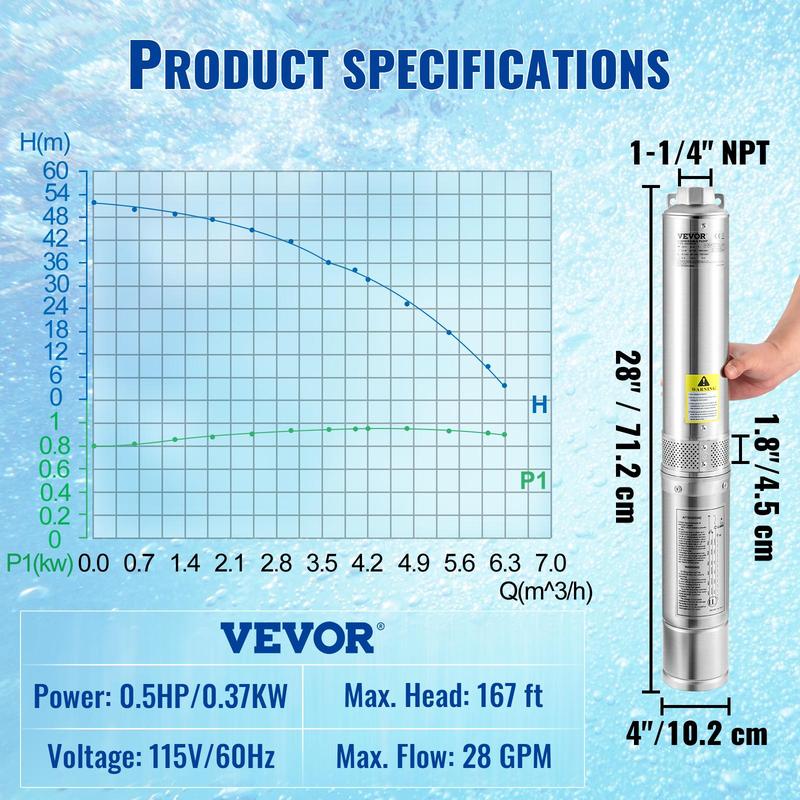 • Enhanced Pump Flow & Head: Power: 0.5HP, 115V; Diameter: 4" (for 4" or bigger well casing); Discharge: 1-1/4" NPT. This deep well submersible pump is designed with 5-stage thermoplastic impellers, providing 28GPM max flow and 167 ft max head. It comes with a 33 ft electric cord, making life without modern plumbing a lot easier. Pump out your worries with ease and relax. No challenge is too big for you.