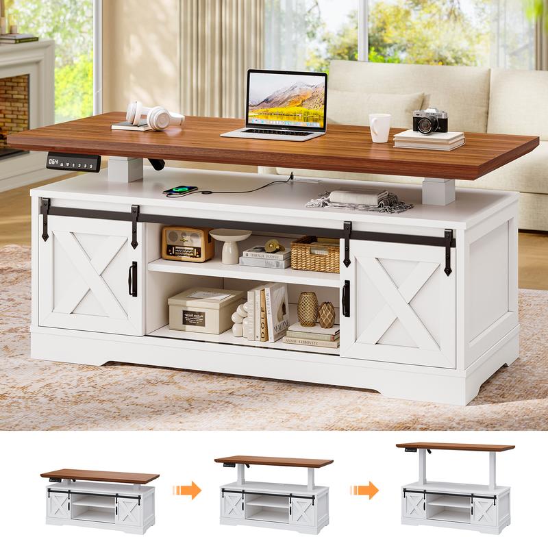 SEDETA 47.2" Farmhouse Lift Top Coffee Table Electric Standing with Storage Power Outlet Sliding Barn Door Height Adjustable for Living Room